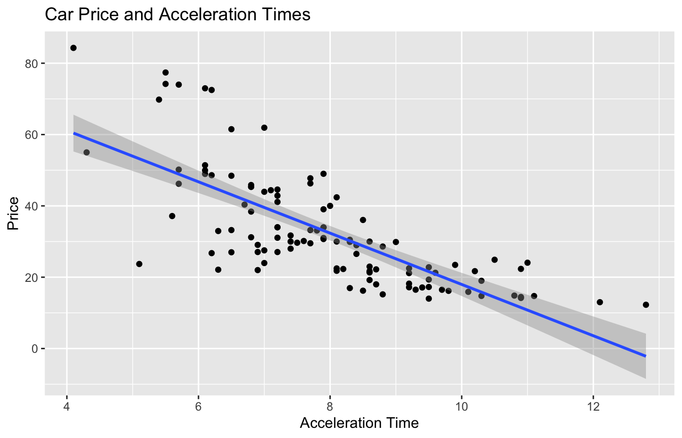- We are 95% confident that the price of a car changes, on average, by multiplicative factor between \(e^{-0.252} = 0.7773\) and \(e^{-0.189}=0.828\) for each additional second in acceleration time. That is, we believe the price decreases between 17% and 23% on average for each additional second in acceleration time.
