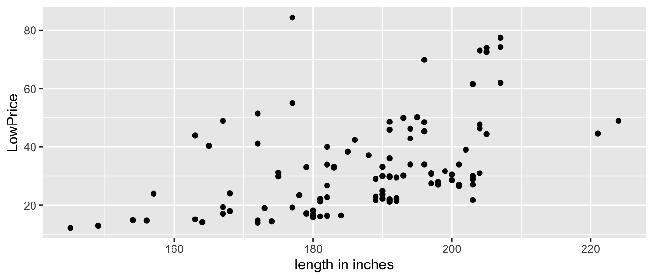 ggplot(data=Cars2015, aes(x=Length, y=LowPrice)) + geom_point() + xlab("length in inches")