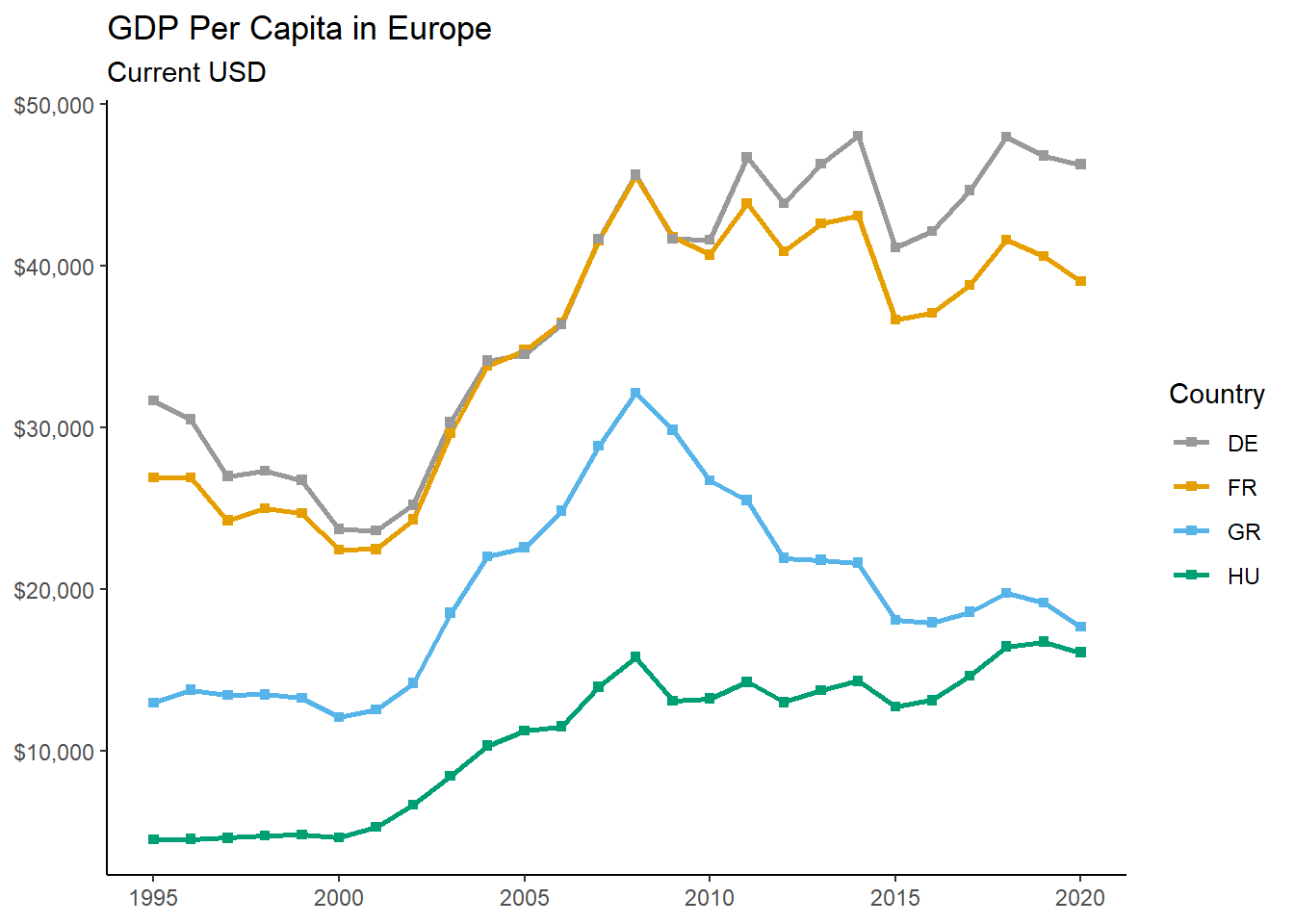 raw_wdi <- WDI(indicator = "NY.GDP.PCAP.CD") Some basic tidyverse syntax allows us to clean and subset out data by selecting columns, renaming variables, and filtering rows.