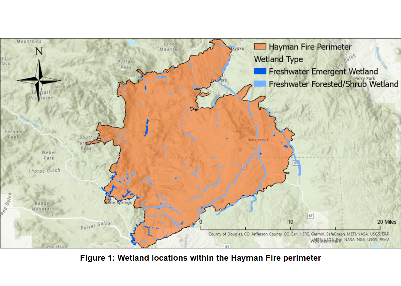 grid::grid.text("Figure 1: Wetland locations within the Hayman Fire perimeter", x = 0.5, y = 0.1,