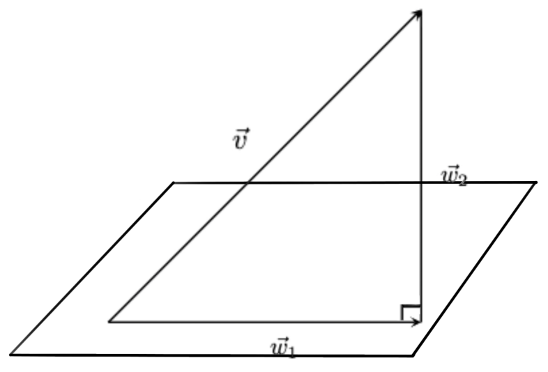 \(\overrightarrow{v} =\overrightarrow{w}_1 + \overrightarrow{w}_2\) where \(\overrightarrow{w}_1\in W\) and \(\overrightarrow{w}_2\perp W\)