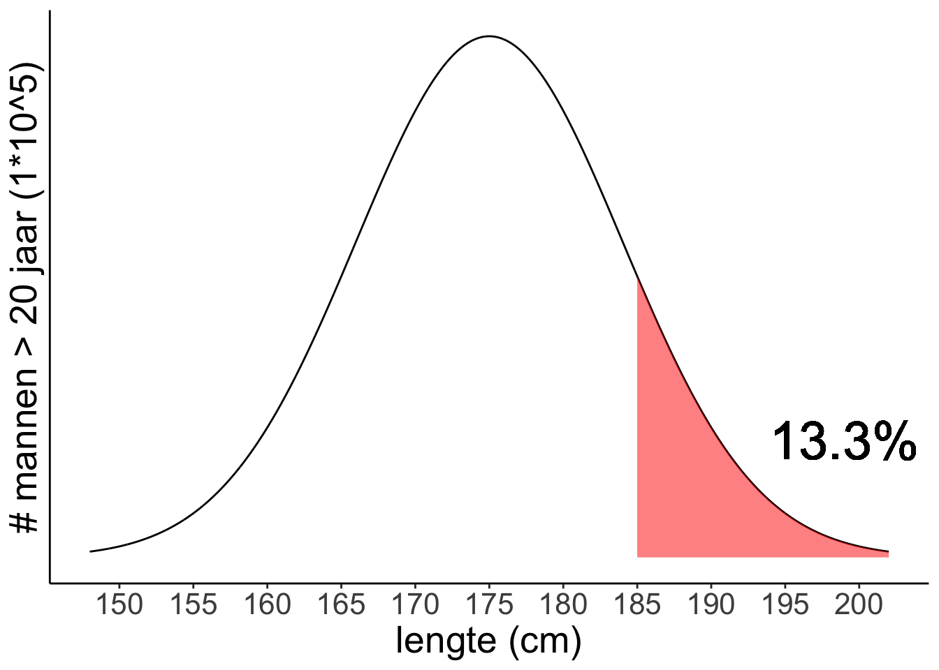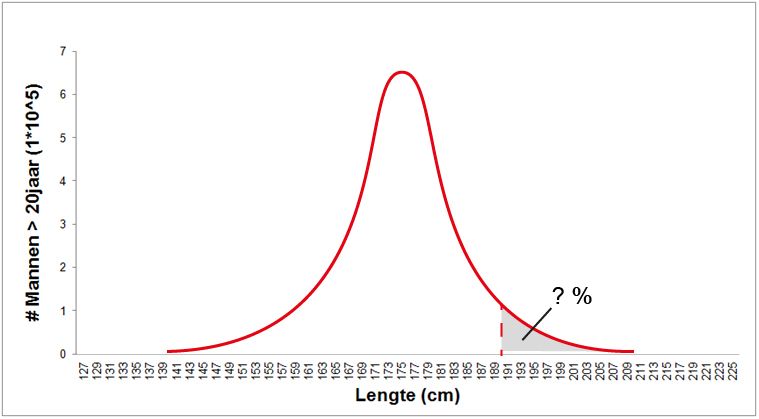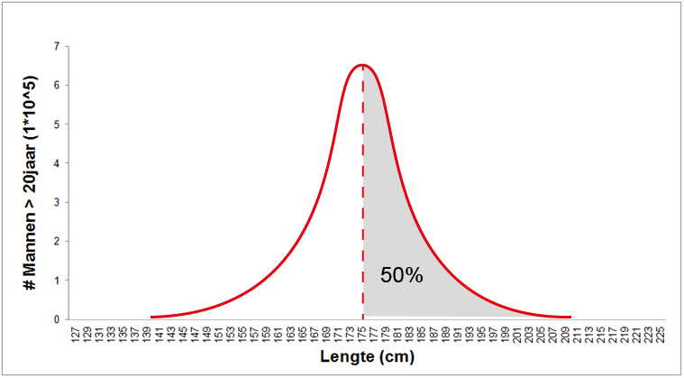 In de grafiek hierboven zitten alle mannen ergens onder die curve, ze zijn allemaal geteld. Het oppervlak onder de curve is dus 100% van de populatie. Dat is handig, want daar kunnen we mee gaan rekenen.
