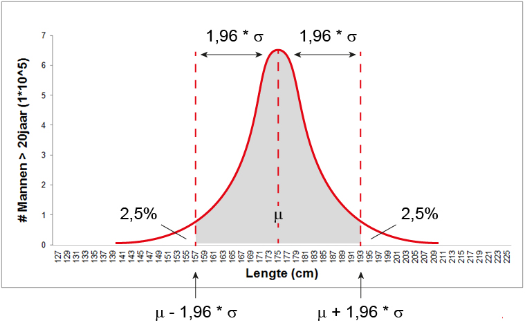 Dus de langste 2,5% van de mannen is tenminste 1,93 meter lang. Als je 1,96 * de standaarddeviatie van het gemiddelde aftrekt, dan berekenen je juist wat de maximale grootte is van de kleinste 2,5% van de Nederlanders: