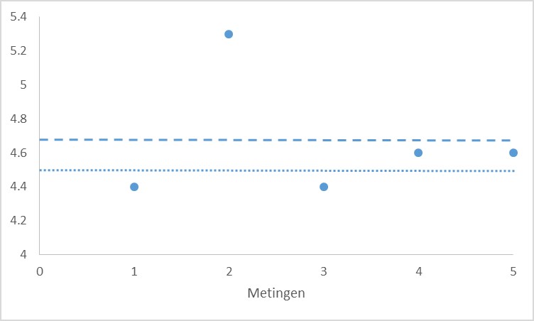Zou best kunnen, maar op basis van de Dixon’s Q-test kun je dat niet bepalen, omdat de andere twee meetwaarden precies even groot zijn. We hebben dus geen idee van de spreiding, en dus ook niet of de meetwaarde van Alyanne erg vreemd is ten opzichte van de spreiding.Exercise 4