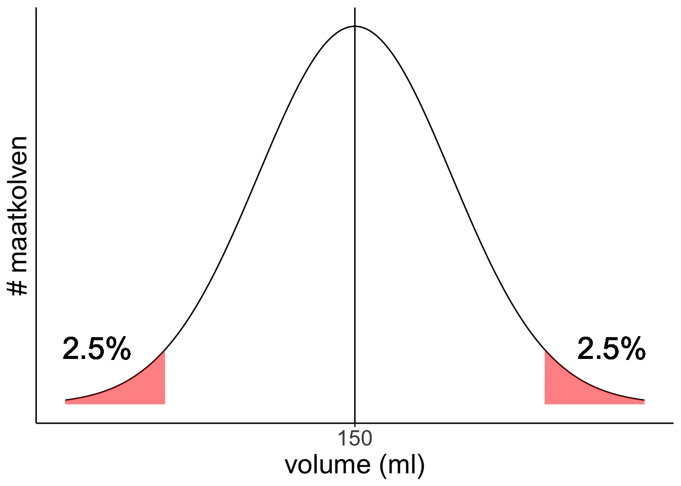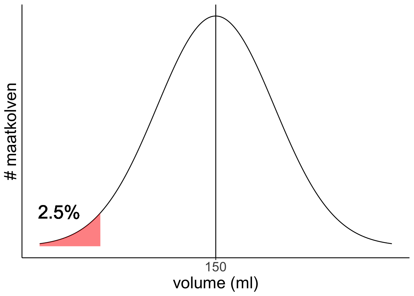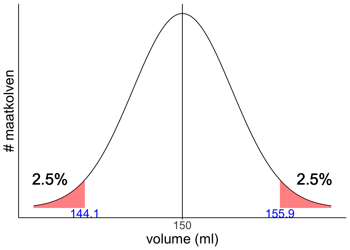 De afstand tot het gemiddelde die we zoeken is net zo groot, maar dan onder het gemiddeld in plaats van erboven: 155,9 - 150 = 5,9 ml.