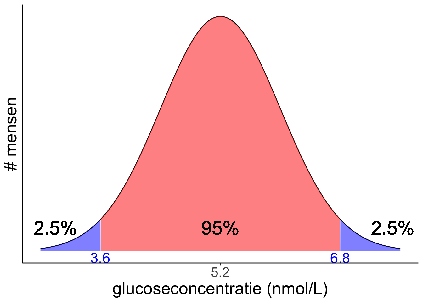 De gemiddelde glucoseconcentratie in het bloed is 5,2 nmol/L voor normale, nuchtere en gezonde mensen. De populatiestandaarddeviatie is 0,8 nmol/L. Binnen welke grenzen zal een willekeurige meting met 95% zekerheid liggen?