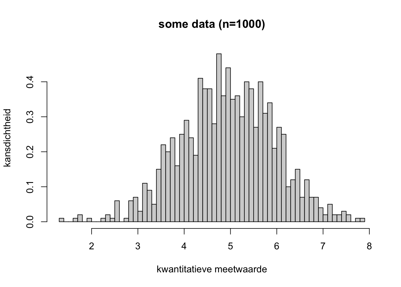 Hierboven hadden we continue data. Een continue variabele zoals lichaamslengte kan (binnen bepaalde grenzen) iedere waarde aannemen, niet alleen hele centimeters.