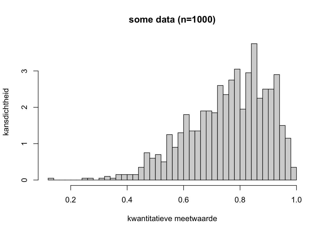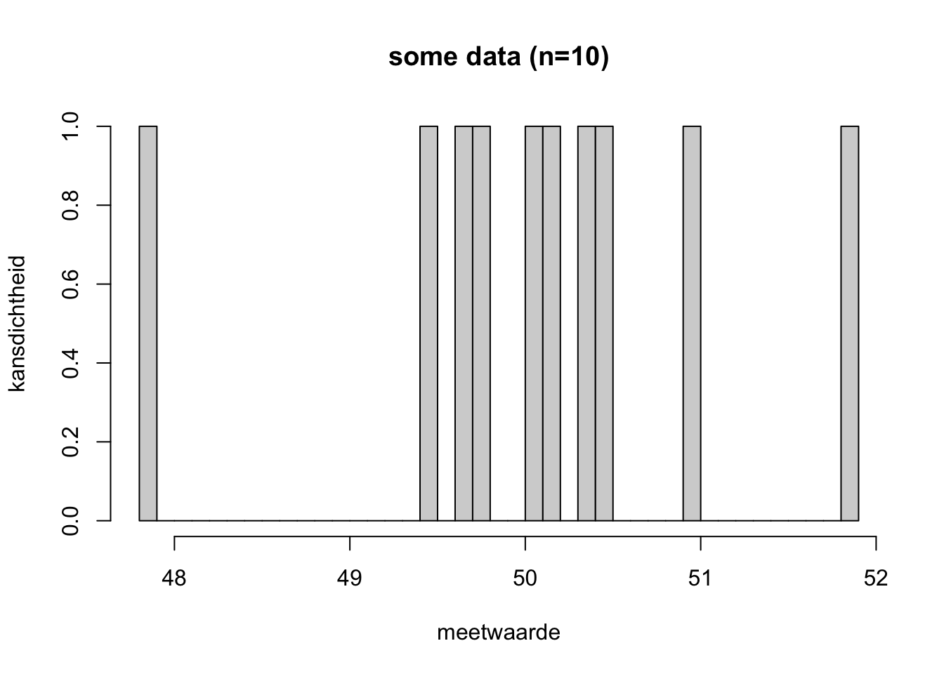 Nu weet je meteen waarom je geen Q-test kunt doen als al je metingen, behalve die ene verdachte, precies gelijk aan elkaar zijn. Dan is \(Q\) namelijk wel altijd 1! Dus wat die verdachte waarde ook is, hij zou altijd als outlier bestempeld worden. Dat mag dus niet.