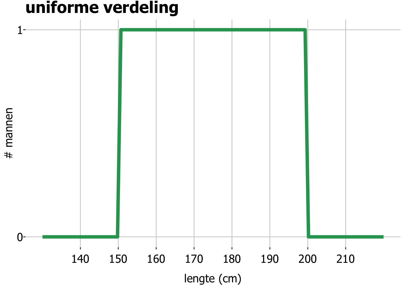 Stel je nu voor dat we 50 mannen hebben gezocht, voor elke cm tussen 150 en 200 cm lengte precies 1 man met die lengte. Dus 1 man met een lengte tussen de 150 en de 151 cm, 1 man met een lengte tussen de 151 en 152 cm, etc. Hoe beschrijf je deze groep mannen met een functie? Die functie ziet er zo uit, alle lengtes tussen 150 en 200 cm komen even vaak voor: