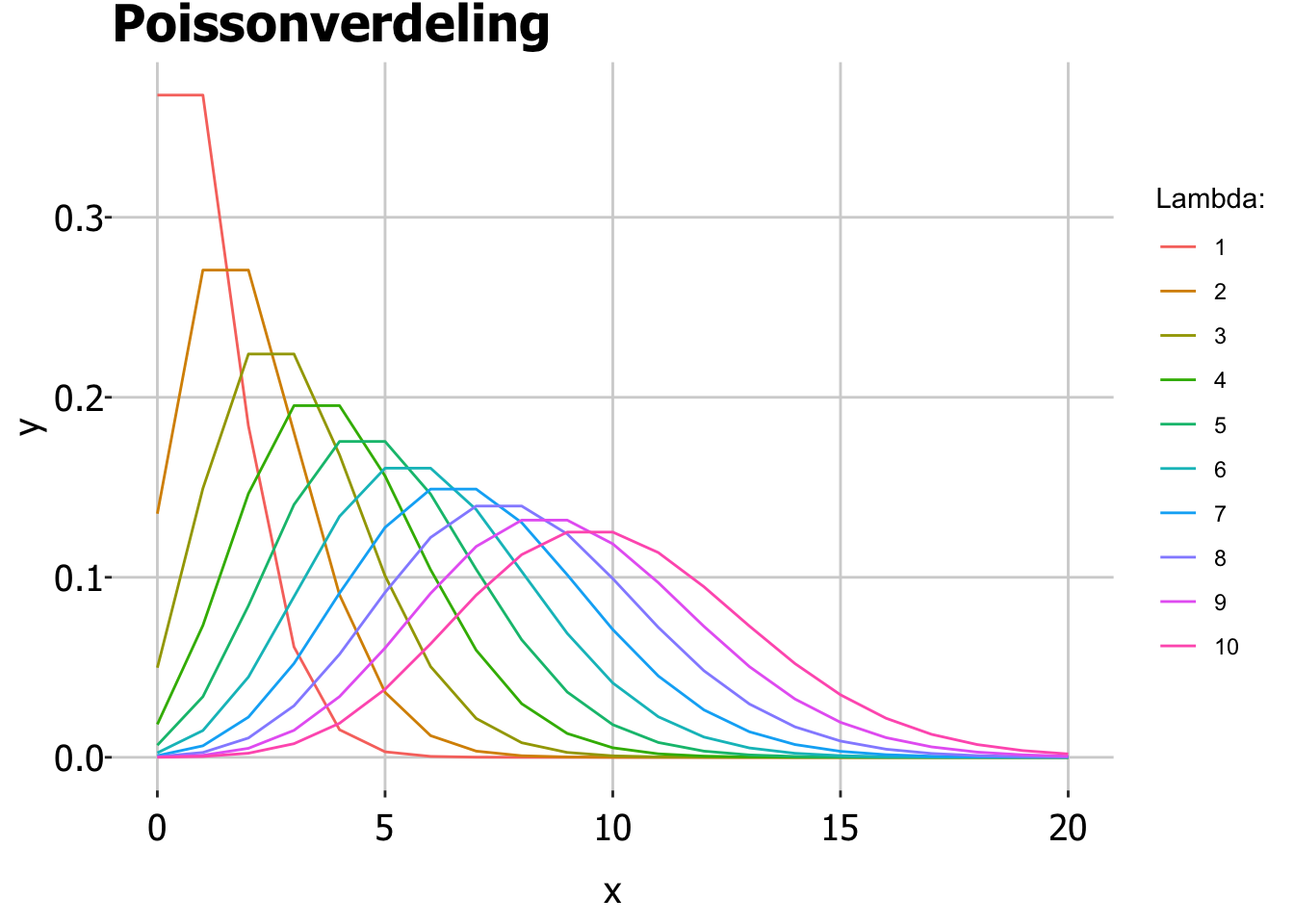 Deze verdeling wordt alleen bepaald door de verwachtingswaarde \(\lambda\) (bijv: het verwachte aantal vissen per uur).