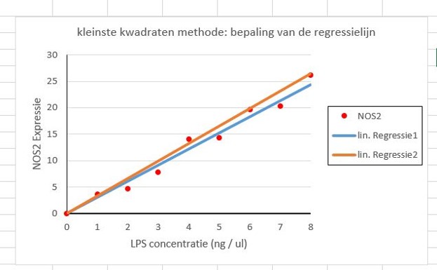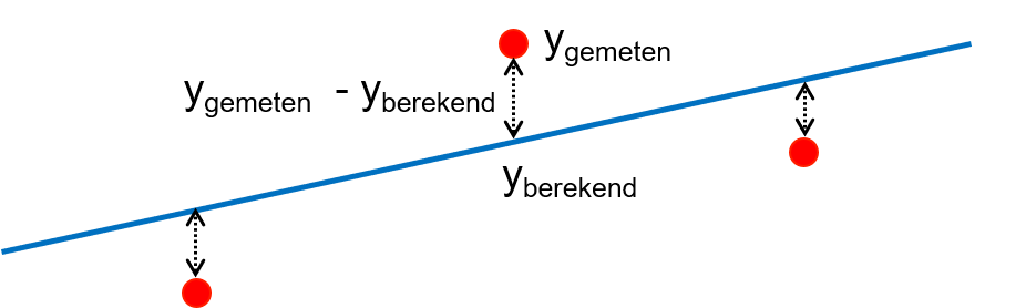Het wiskundige equivalent van een rechte lijn trekken waar alle punten zo dicht mogelijk bij liggen wordt lineaire regressie genoemd. De rekenmethode die daarvoor wordt gebruikt heet de kleinste kwadratenmethode. Die methode komt hierop neer: voor een gegeven lijn bereken je de afstanden van alle meetpunten tot de lijn. Je kwadrateert alle afstanden en telt ze op. De beste lijn is de lijn waarbij deze som het kleinst is (zie figuur hieronder voor een grafische weergave van de kleinste kwadratenmethode). Gelukkig kan met behulp van Excel de best passende ijklijn eenvoudig worden vastgesteld (zie ook de Excel opdrachten die bij deze les horen).
