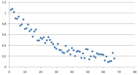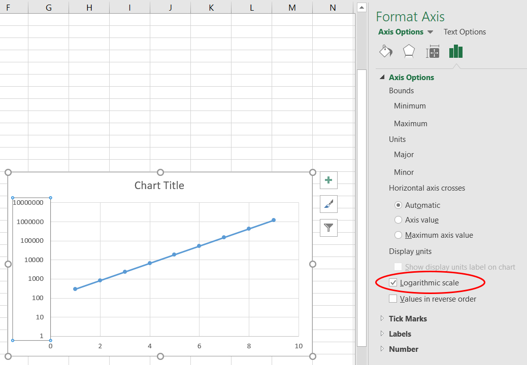 Dat is in deze grafiek niet af te lezen.- Maak het verband lineair door de y-as logaritmisch te maken. Dit doe je achtereenvolgens met de rechtermuisknop op de y-as te klikken en vervolgens de optie