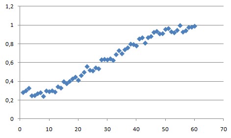 Let op het verschil met de correlatie: de spreiding op de x-as staat nu vast. Die hebben we namelijk zelf zo ingesteld: 1.5 tot 5, met stapjes van 0.1. De spreiding op de y-as lag niet vast, die variabele hebben we gemeten.
