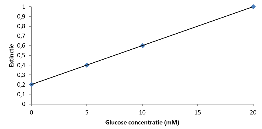Om in een aantal monsters de zetmeelconcentratie te kunnen bepalen, zijn van bekende concentraties zetmeel de extincties gemeten. Met behulp van de gevonden waarden kan een ijklijn worden opgesteld.