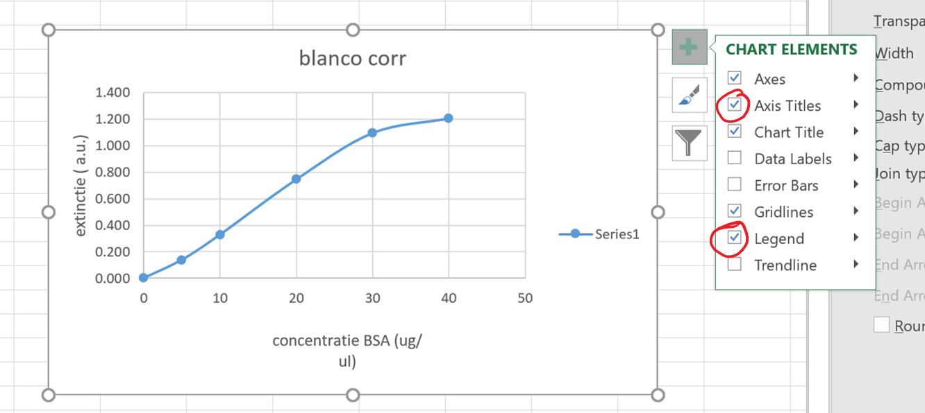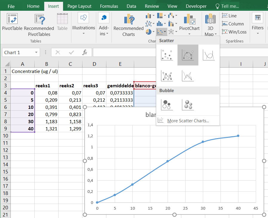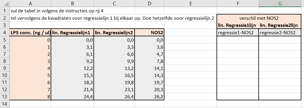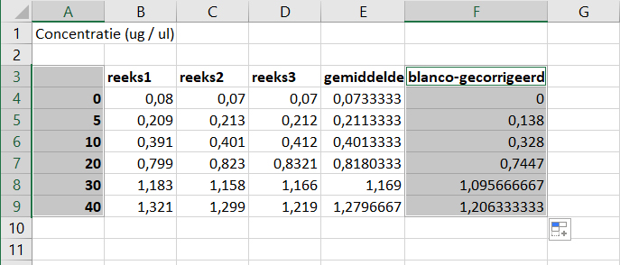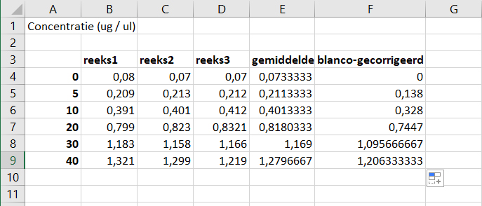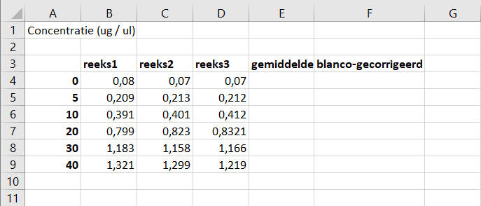Voor dit deel van het werkcollege dien je het bestand IjklijnZetmeel.xlsx te openen. Dit bestand bevat de metingen voor de ijklijn.