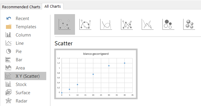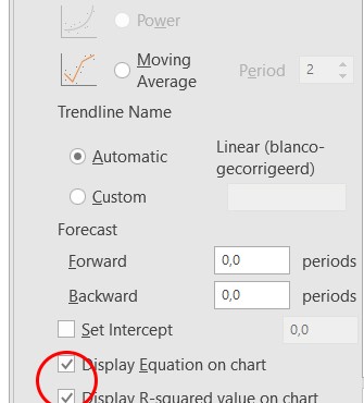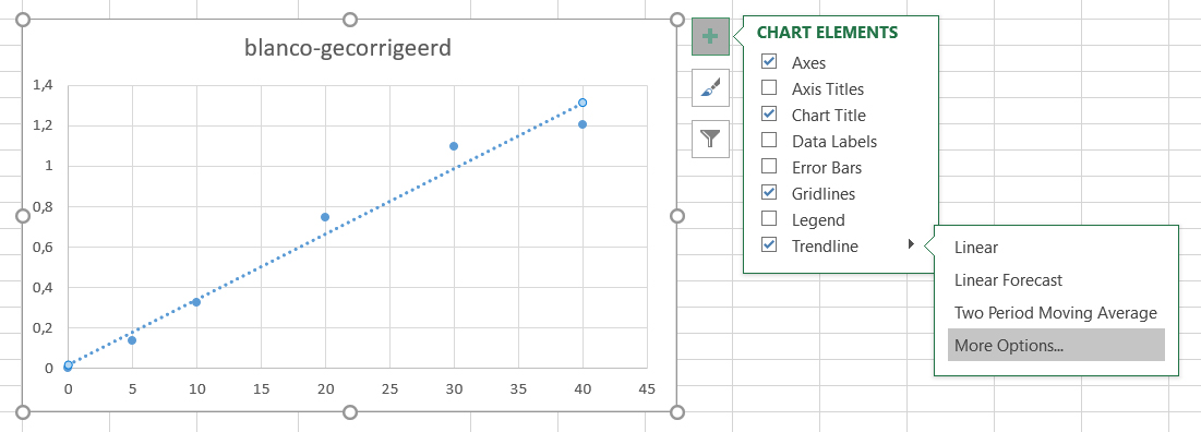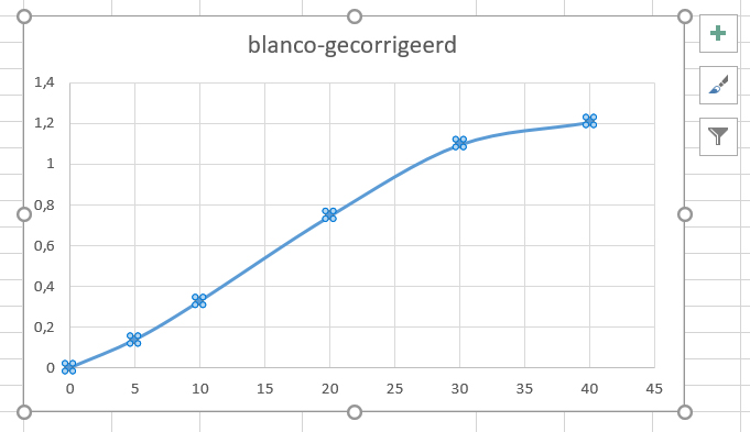 Let op! In dit geval moet je de hoogste 3 meetwaardes weglaten, omdat deze buiten het lineaire gebied van de ijklijn vallen. Laat de regressielijn nooit kunstmatig door (0,0) lopen, want dat maakt de ijklijn minder betrouwbaar (dat is een knopje in Excel. niet aanklikken dus). Het datapunt (0,0) neem je wel gewoon mee (de blanko-gecorrigeerde blankometing is natuurlijk sowieso nul), gooi die niet weg.Exercise 3