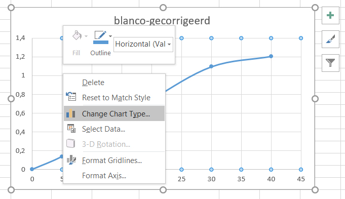 Let op dat de correlatie-coefficient niet die \(R^2\) is die Excel voor je in het grafiekje kan zetten, maar gebruik CORREL().