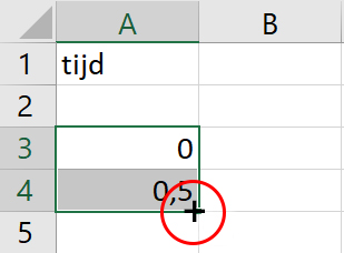A11(Excel vult nu automatisch de cellen in met stapjes van 0,5).