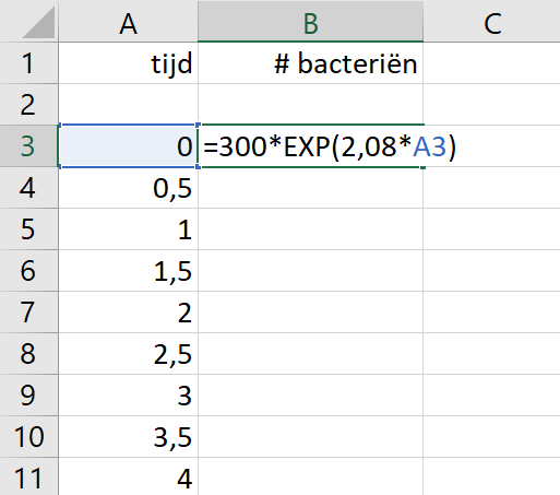 Met de functie \(N(t) = 300 \cdot e^{2,08t}\) kunnen we op een gewenst tijdstip de hoeveelheid bacteriën berekenen. Het invullen van formules in Excel kan soms lastig zijn als de formule uit meerdere componenten bestaat. In dit geval zijn er 3 componenten. De constante (\(300\)) en de vermenigvuldiging (\(2,08\cdot t\)) zijn makkelijk in te voeren in Excel. Maar hoe rekenen we met de exponent? Excel heeft honderden ingebouwde functies, waaronder ook de EXP() functie.