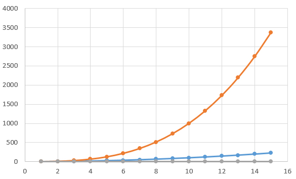 Een exponentiële functie.We gaan nu in Excel een grafiek maken die de groei van het aantal bacteriën weergeeft in de tijd van 0 tot 4 uur (met stapjes van 0,5 uur) volgens onderstaande stappen: