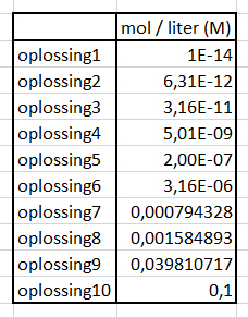 - Bereken voor iedere concentratie HCl (= H+) de pH. De formule voor een logaritme is ‘log’. Typ