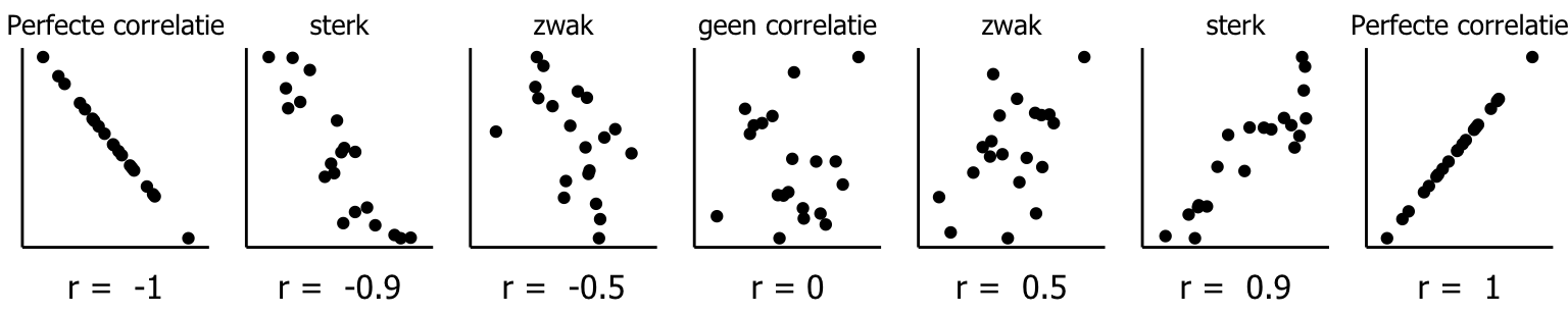 Hoe sterk het verband tussen de variabelen is kunnen we uitdrukken in een getal, de correlatiecoëfficiënt (\(r\)). De formule voor de correlatiecoëfficiënt hoef je niet te kennen, maar is als volgt:
