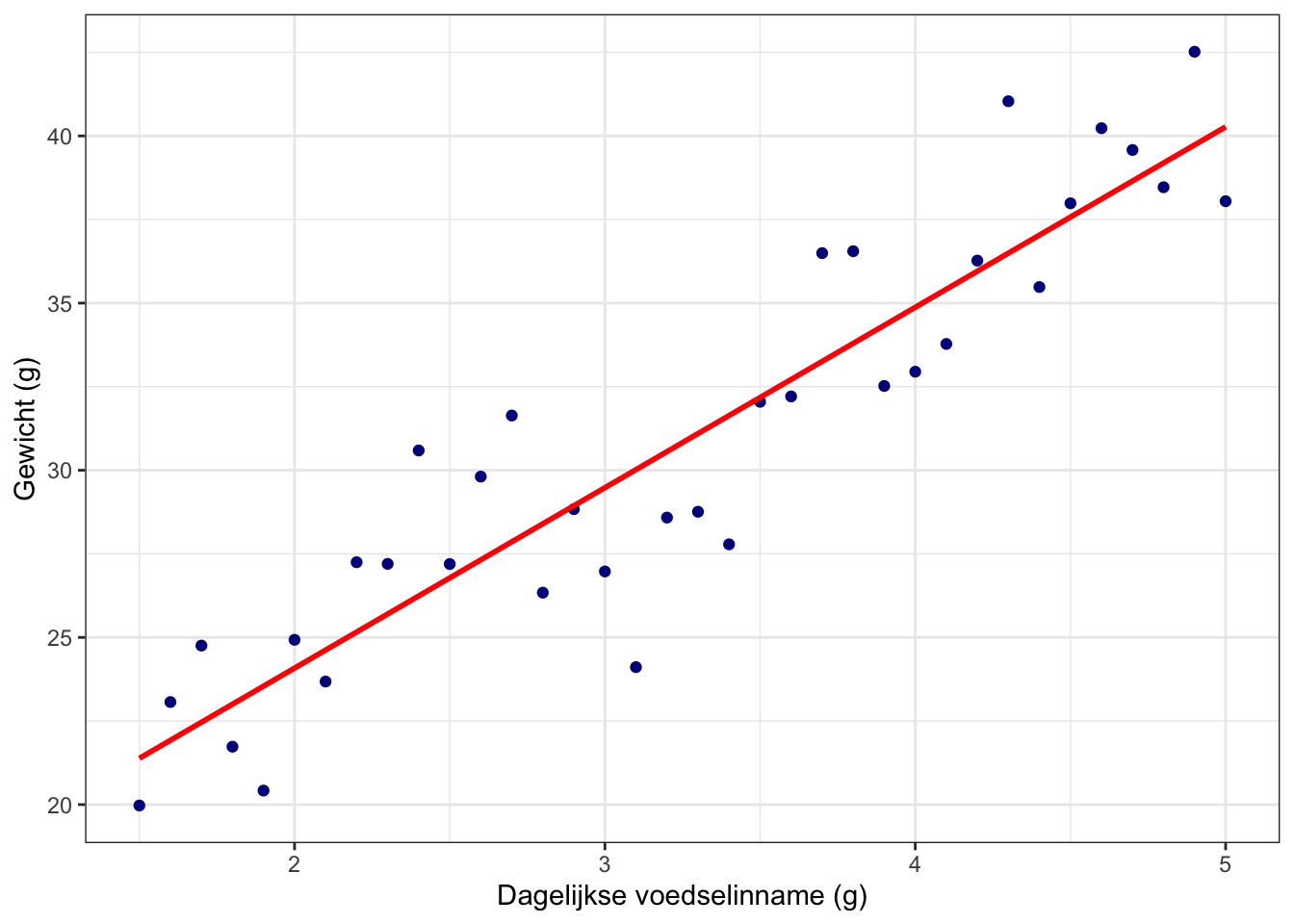 Hoe goed onze voorspelling voor het gewicht van een nieuwe ongewogen hamster gaat zijn, hangt af van hoe goed die lijn op onze punten past (de x- en y-waarden). Dit wordt uitgedrukt in de determinatiecoëfficiënt (\(R^2\)). En we hebben geluk: in het geval van een lineair verband tussen twee variabelen (dus een rechte lijn), is dat gewoon het kwadraat van de correlatiecoëfficiënt (dus hier geldt: \(R^2 = r^2\)).