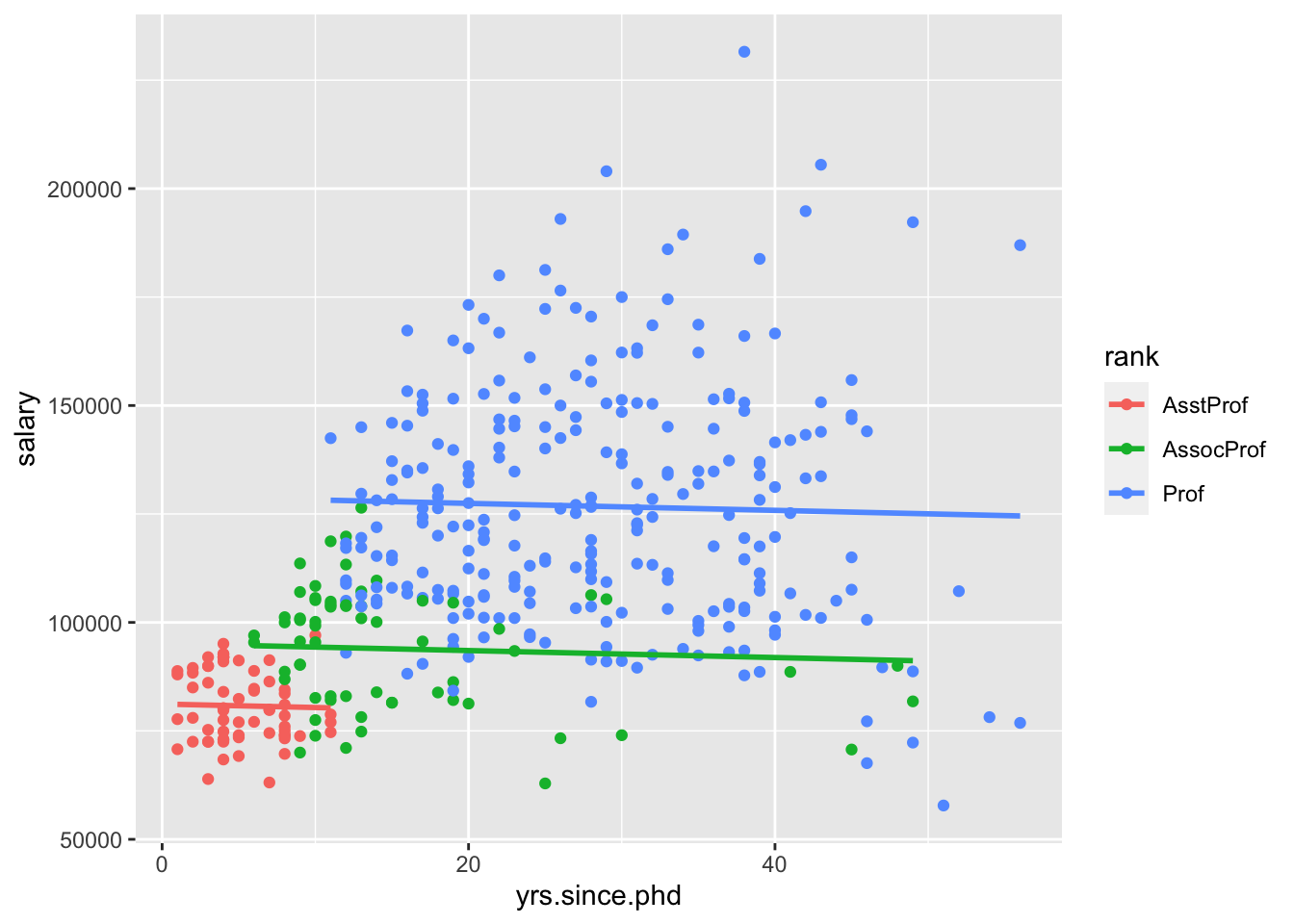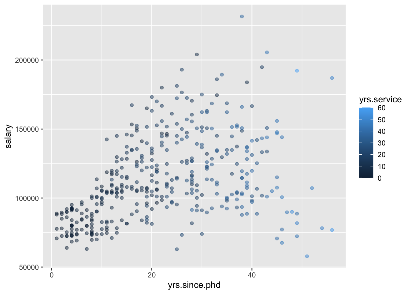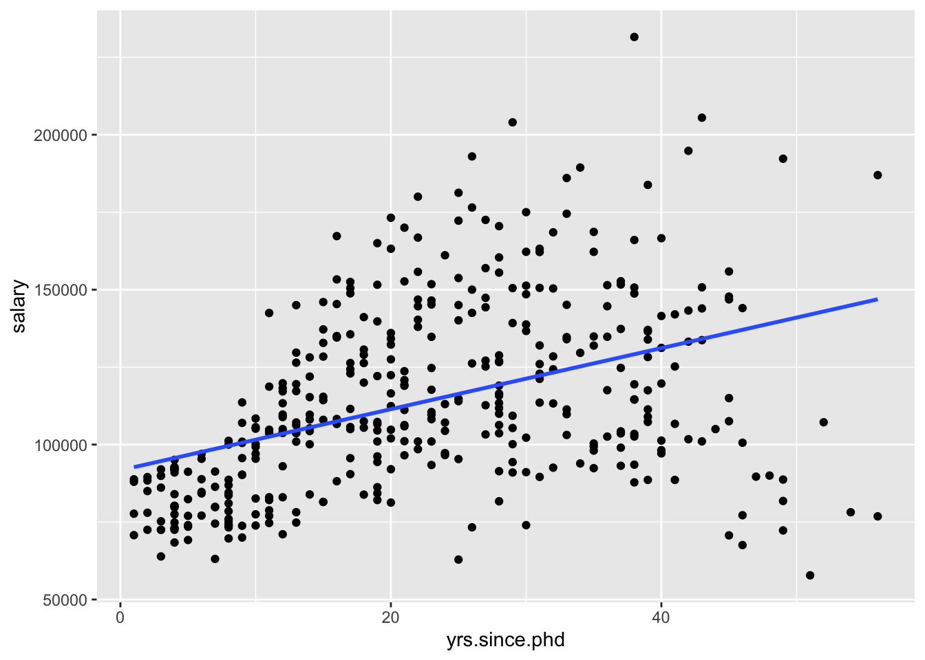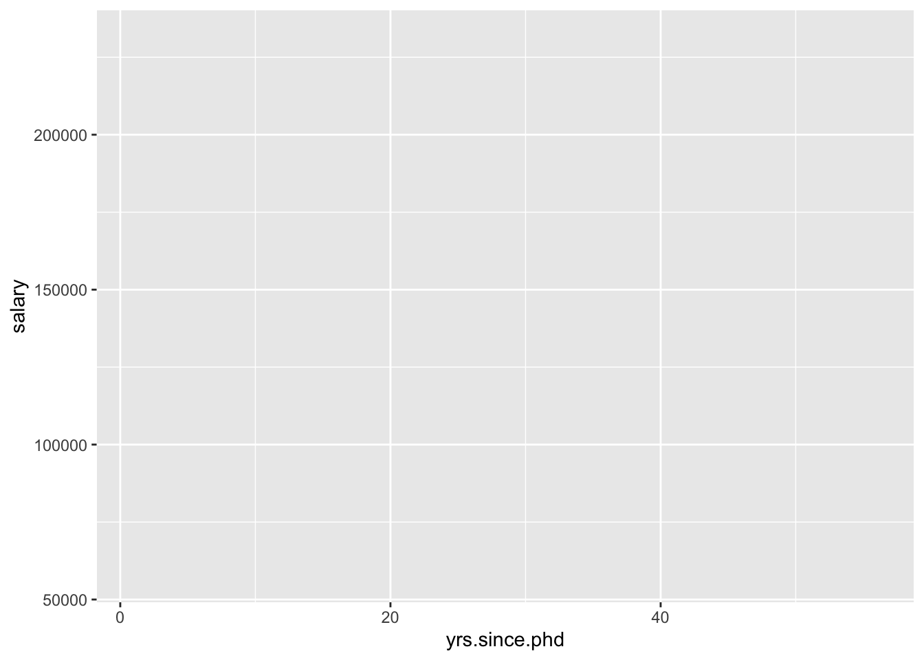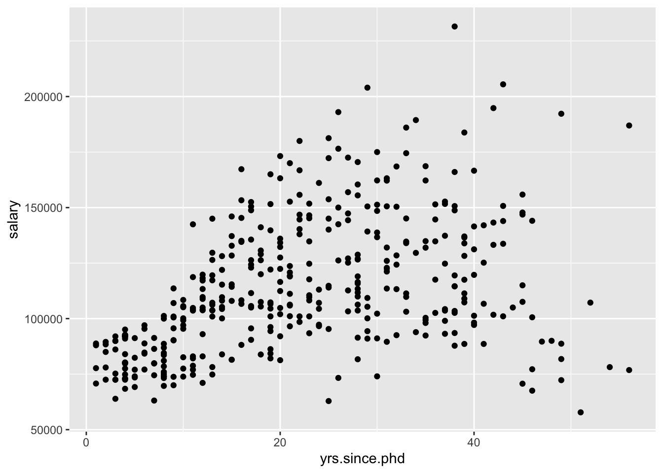 # ggplot(Salaries, aes(x = yrs.since.phd, y = salary)) +