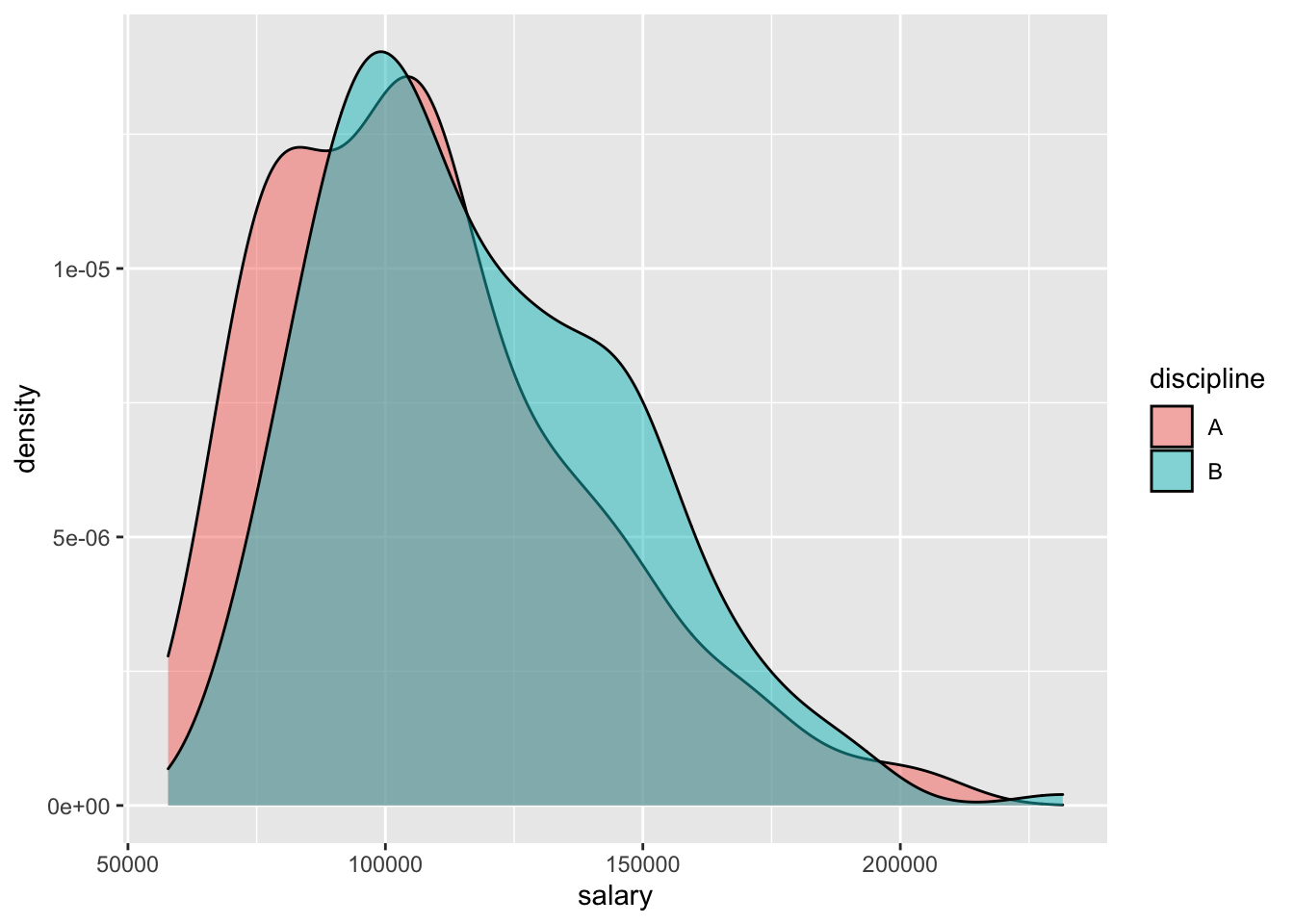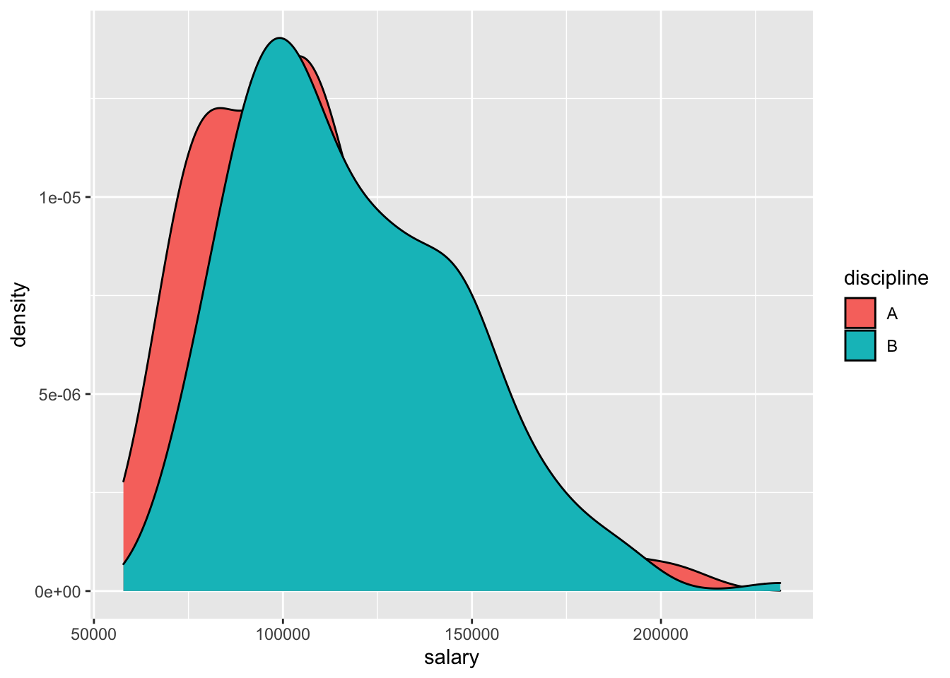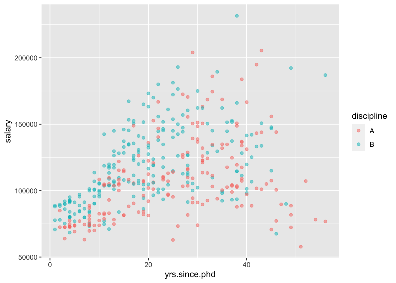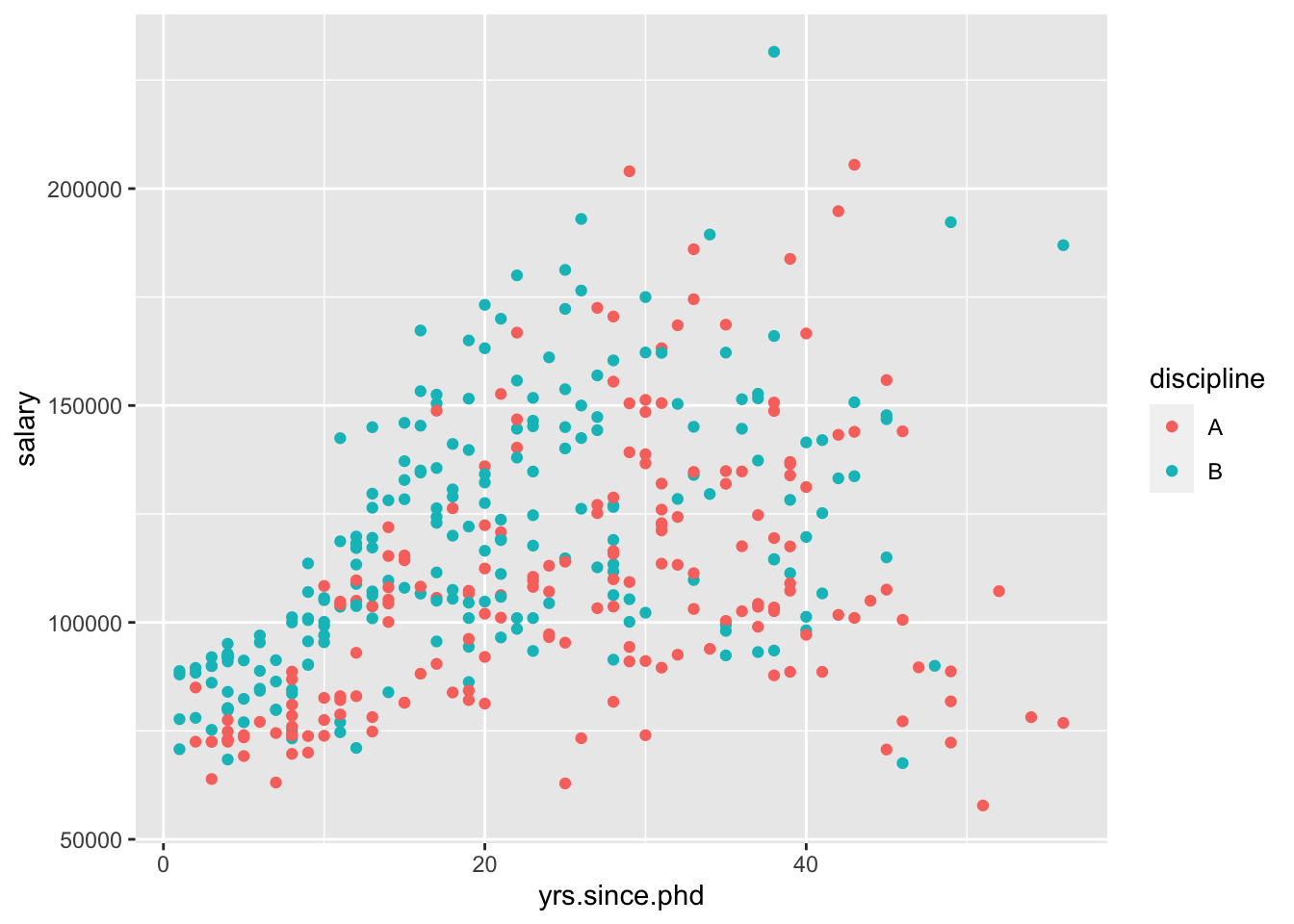 salaryvs.yrs.since.phd(scatterplot, geom_point)salaryvs.yrs.service(scatterplot, geom_point)salaryvs.discipline(side-by-side boxplots, side-by-histograms)salaryvs.yrs.since.phdanddiscipline(in one plot) (scatterplot with colored dots)salaryvs.yrs.since.phdandsex(in one plot) (scatterplot with colored dots)