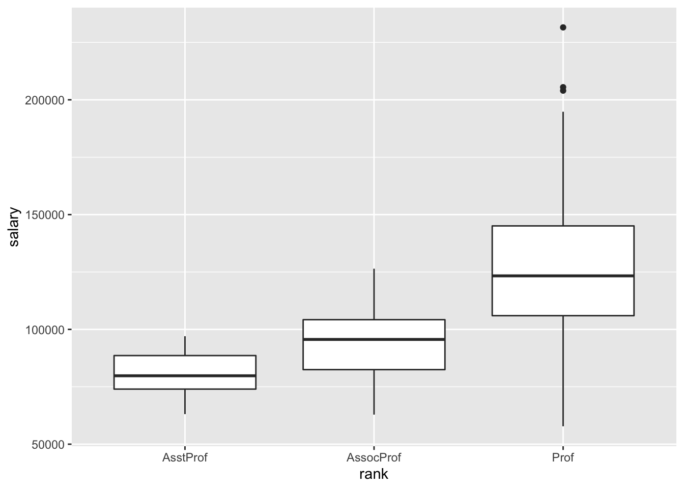 # practice: make side-by-side boxplots of salary by rank- Scatterplots of 2 quantitative variables plus a categorical