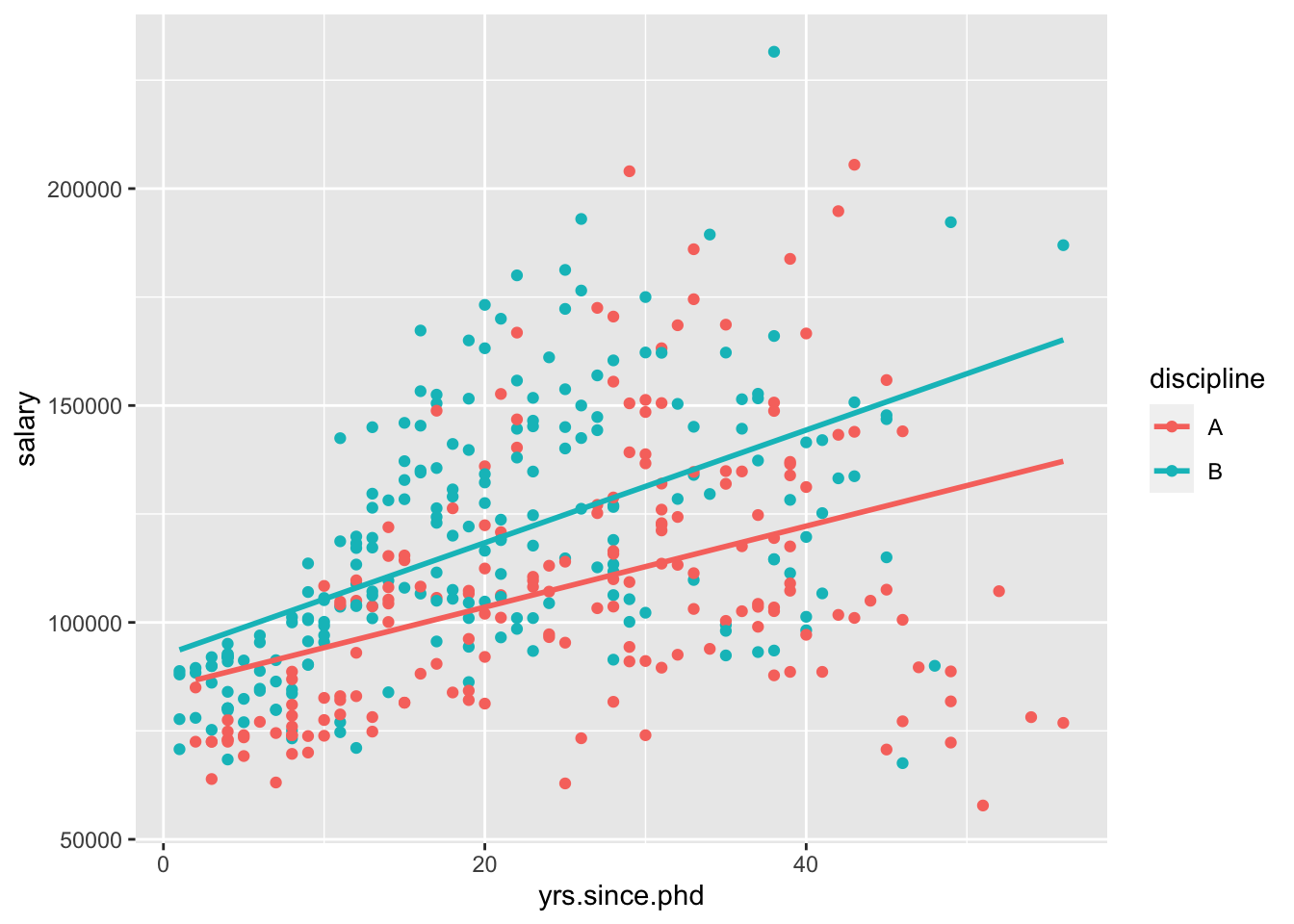 If yrs.since.phd and discpline both explain some variability in salary, why not look at all the variables at once?