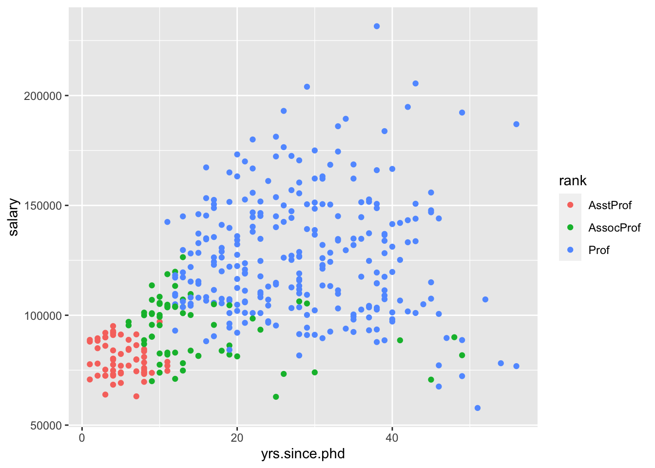 salaryvs.yrs.since.phdsalaryvs.yrs.servicesalaryvs.disciplinesalaryvs.yrs.since.phdanddiscipline(in one plot)salaryvs.yrs.since.phdandsex(in one plot)