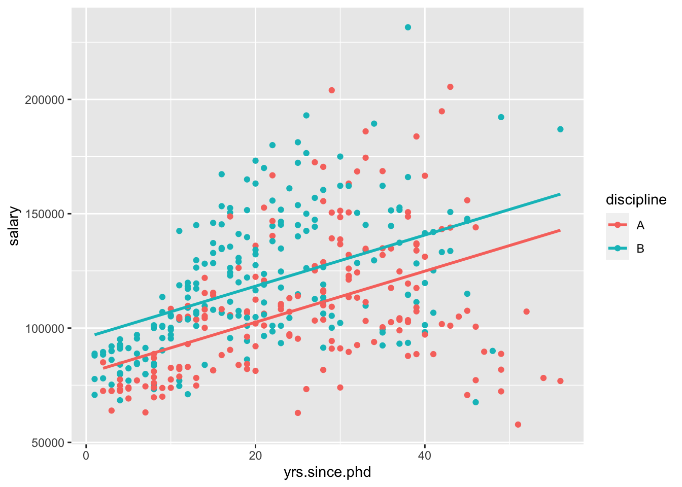 This model assumes that the relationship between yrs.since.phd and salary is the same between disciplines. However, we could include an interaction between the two variables,