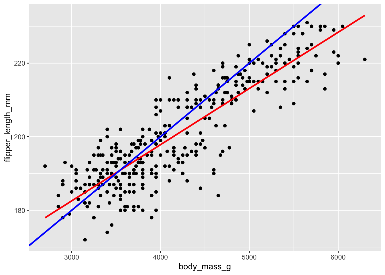 Let response variable \(Y\) be the length in mm of a penguin’s flipper and \(X\) be their body mass in grams. Then the (population) linear regression model of \(Y\) vs \(X\)