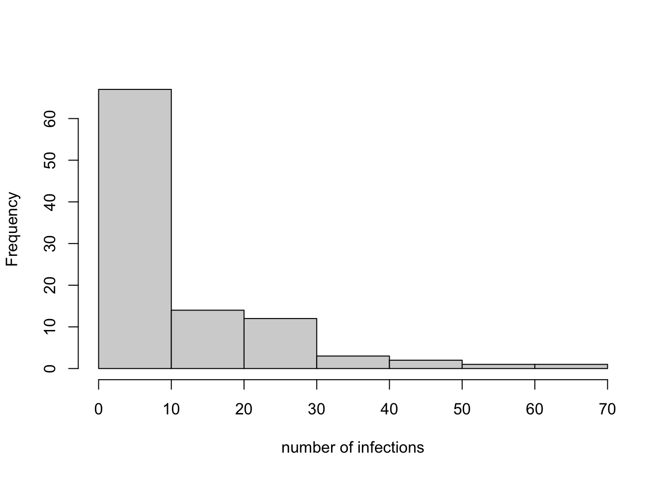 The histogram shows a range of infection frequencies across the 100 runs, most commonly zero or near to zero, and less frequently greater than 10. The mean number of infections is 10.42, and 0.37 of the runs count as ‘outbreaks’ according to Salathé & Bonhoeffer (2008). This should be similar to the value of 0.4 found by Salathé & Bonhoeffer (2008; Figure 1c), although not exactly because they ran 2000 simulations rather than 100.