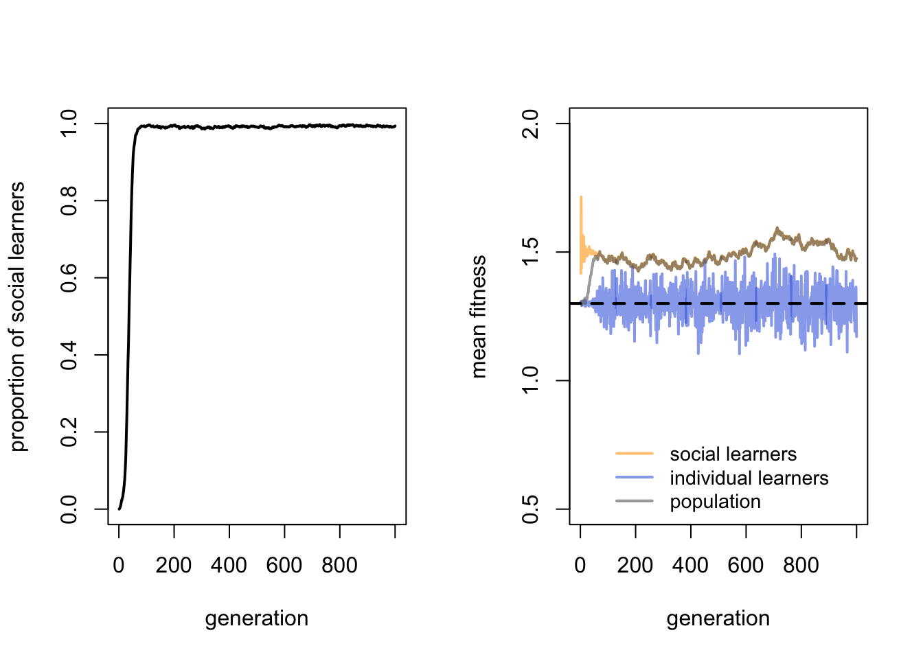 Rogers’ model, and even Enquist et al’s extension, are hugely unrealistic in many ways. Despite this, these models give valuable insights into the evolutionary advantages and disadvantages of social learning relative to individual learning. Social learning benefits from being less costly than individual learning. Yet social learning does not respond well to environmental change. When environments change, social learners are left copying each other’s outdated incorrect behaviour. Individual learners suffer no such penalty when the environment changes. This trade off can lead to a mixed equilibrium where individual and social learners coexist.