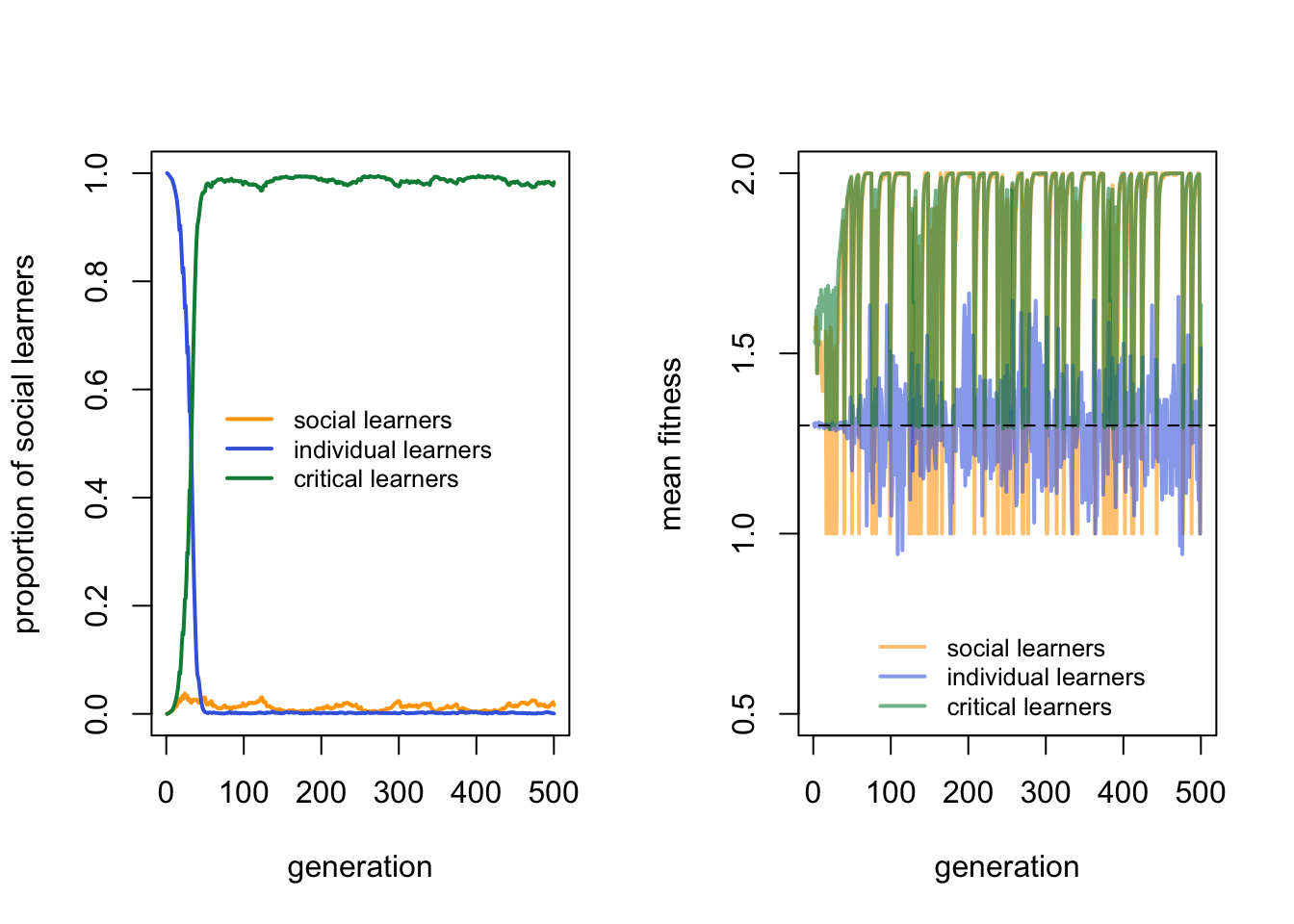 Critical social learning can also be seen as supporting a form of cumulative culture. As critical learners increase in frequency, each new generation contains more and more correct individuals. New critical learners can copy these accumulated correct behaviours for free. That is, until the environment changes, at which point the accumulation begins again.