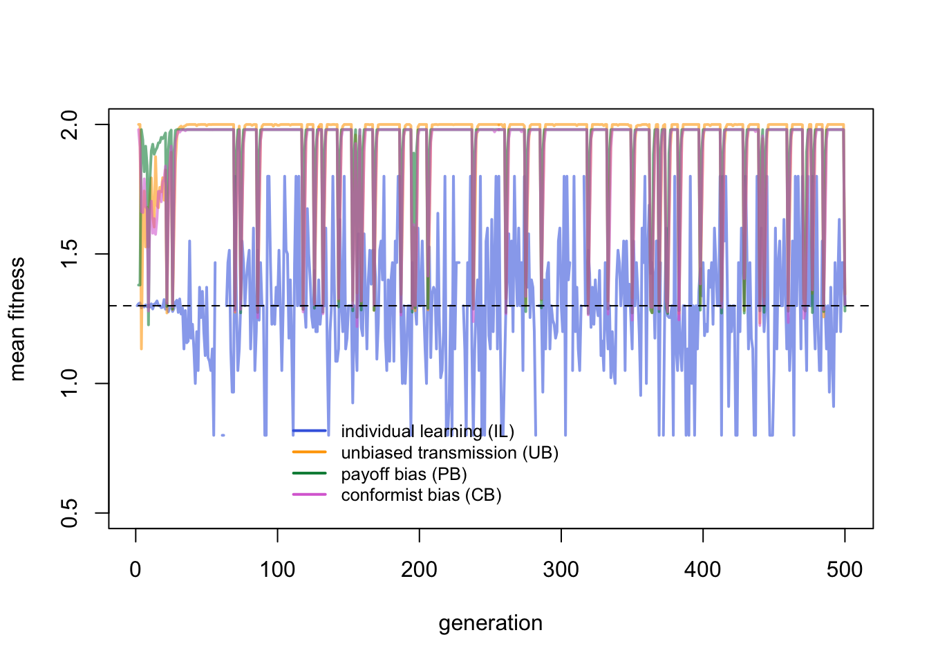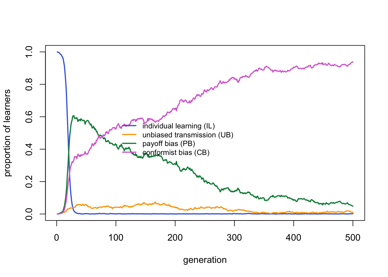 Nakahashi, W., Wakano, J. Y., & Henrich, J. (2012). Adaptive social learning strategies in temporally and spatially varying environments: How temporal vs. spatial variation, number of cultural traits, and costs of learning influence the evolution of conformist-biased transmission, payoff-biased transmission, and individual learning. Human Nature, 23, 386-418.