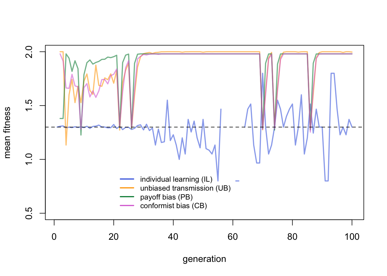 The success of CB in spatially varying environments hinges on whether it is less costly than PB. Is this a plausible assumption? Nakahashi et al. (2012) think so, arguing that “[t]his assumption seems plausible, given that [PB] have a more complicated task than [CB], which involves assessing payoffs or at least relative payoff differences for the cultural traits present.” (p.405). While that may be the case, tallying the frequencies of multiple traits across multiple demonstrators also seems quite costly. Empirically quantifying the costs of social learning strategies such as CB and PB would be a worthwhile endeavour.