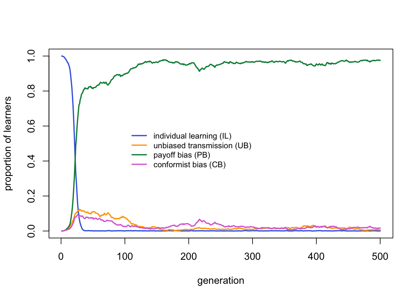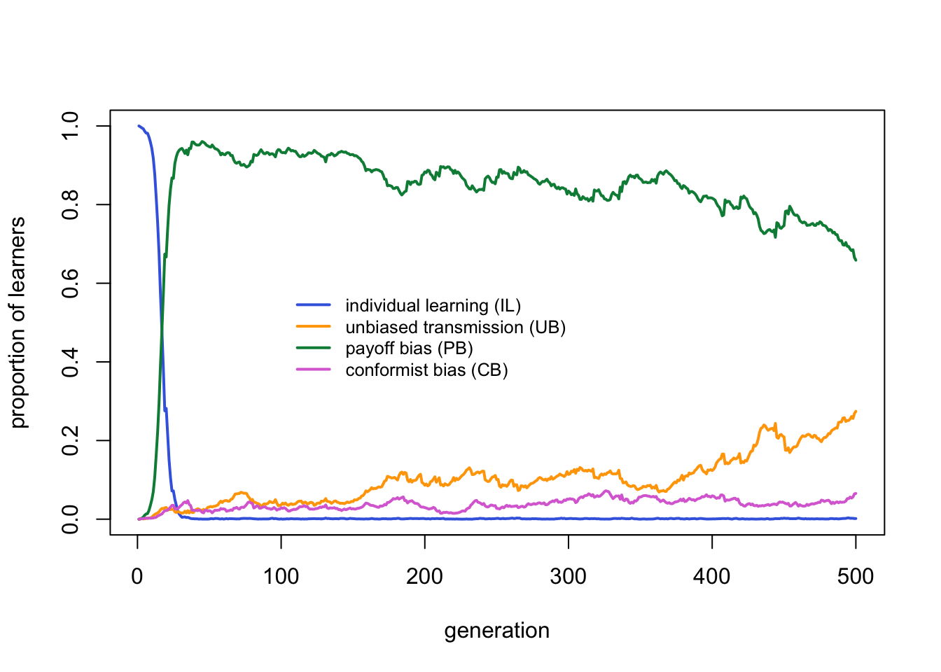 In Model 19 we will therefore look at the evolution of the more sophisticated social learning strategies (Laland 2004) that we have covered previously: directly biased transmission from Model 3, where agents preferentially copy traits based on their characteristics, in this case their payoffs (hence ‘payoff bias’ for short), and conformist biased transmission from Model 5, where agents preferentially copy the most common trait amongst a set of demonstrators irrespective of trait characteristics. While those previous models examined the cultural dynamics that each of these transmission biases or strategies generate, here we are interested in when and why a capacity or tendency to employ such strategies evolve in the first place.