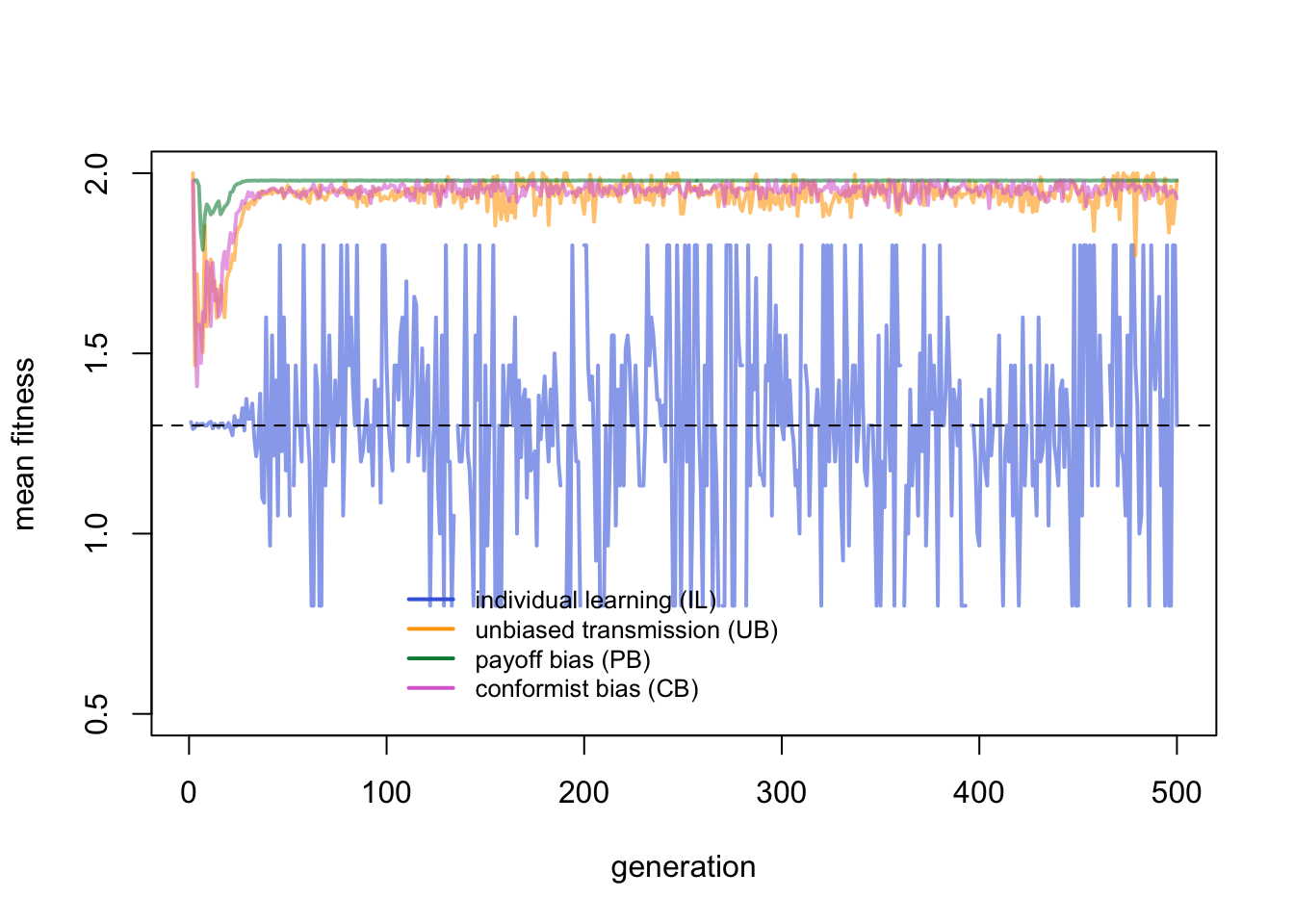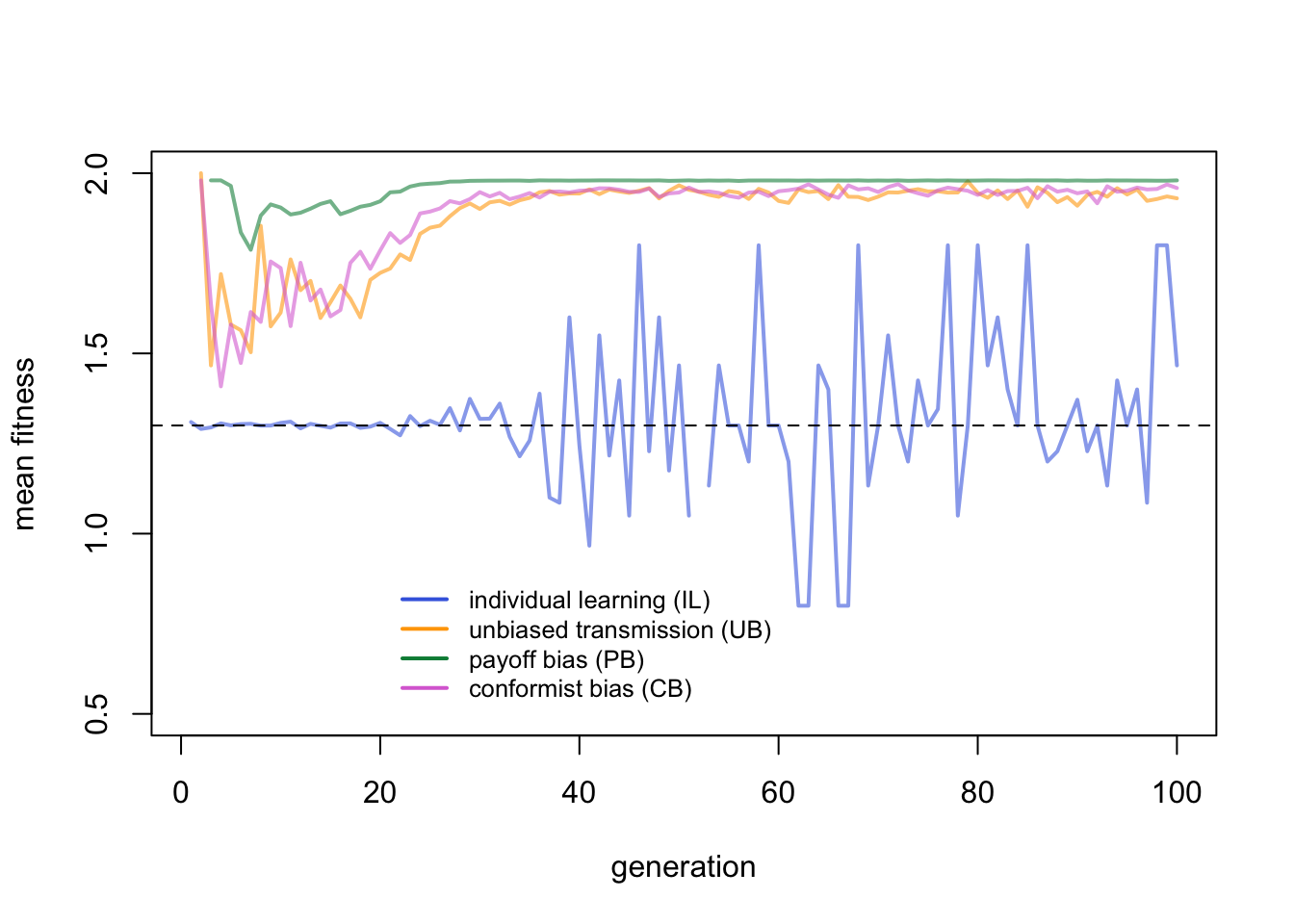 Before getting to the main code, let’s simulate the first generation of individual learning to provide the critical learners with demonstrators in generation two onwards. The following code, all familiar from Model 18, runs individual learning and calculates fitnesses: