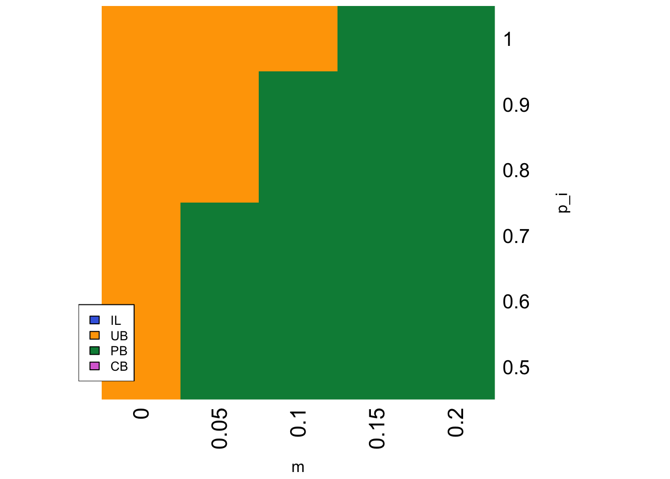 PB is favoured when \(m\) is relatively large and \(p_i\) is relatively low. When \(m = 0\) there is no migration and hence no environmental change. Just as for stable environments in Model 19a, UB agents are favoured because the correct behaviour quickly spreads in each sub-population and UB agents can copy this correct behaviour at lower cost than the other strategies. As migration increases, PB agents do better than UB agents when they migrate because of their larger pool of demonstrators when \(n > 1\). Similarly, as \(p_i\) increases then the correct behaviour becomes more common even amongst migrants, such that UB agents can easily copy the correct behaviour at lower cost than PB and CB.