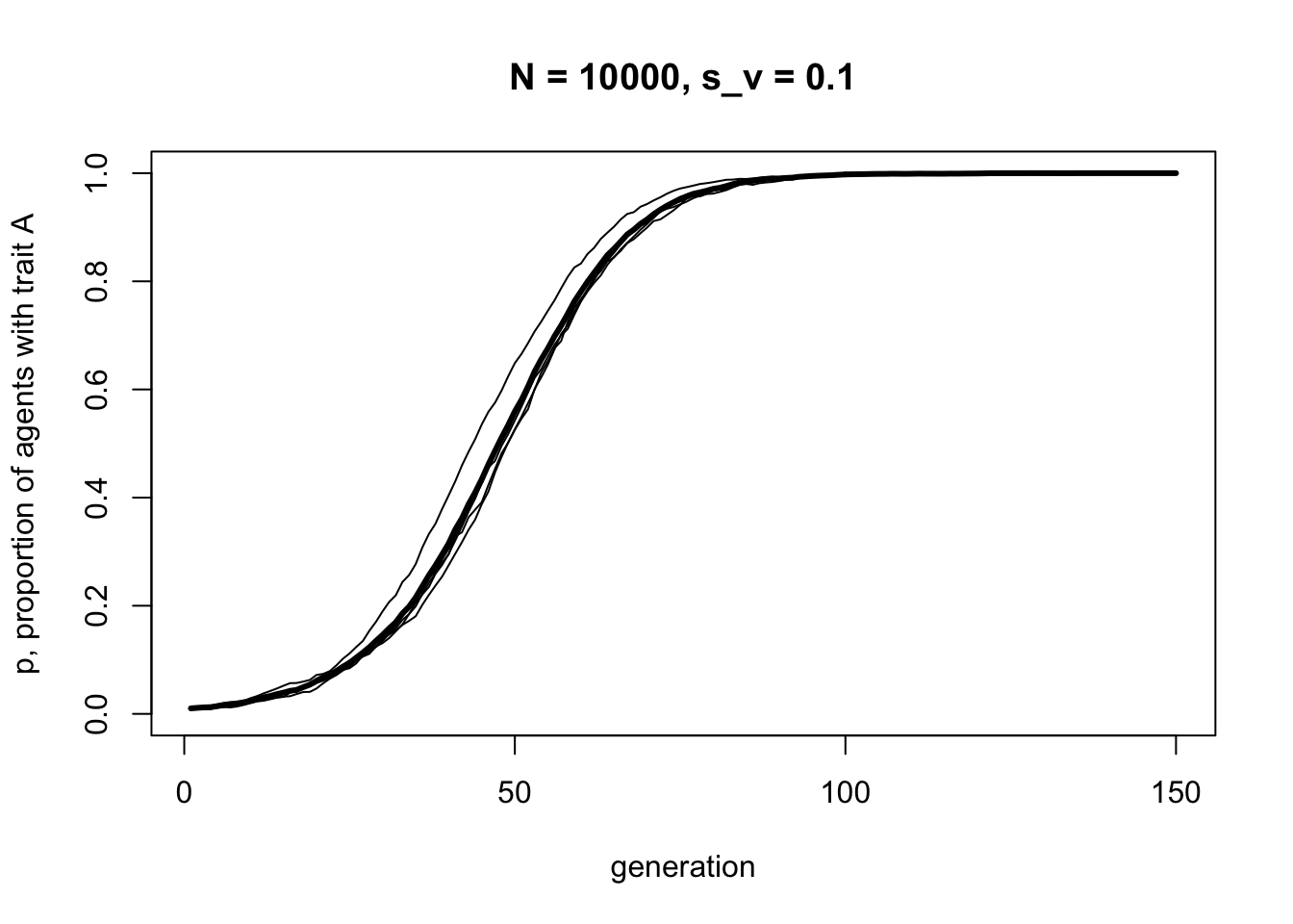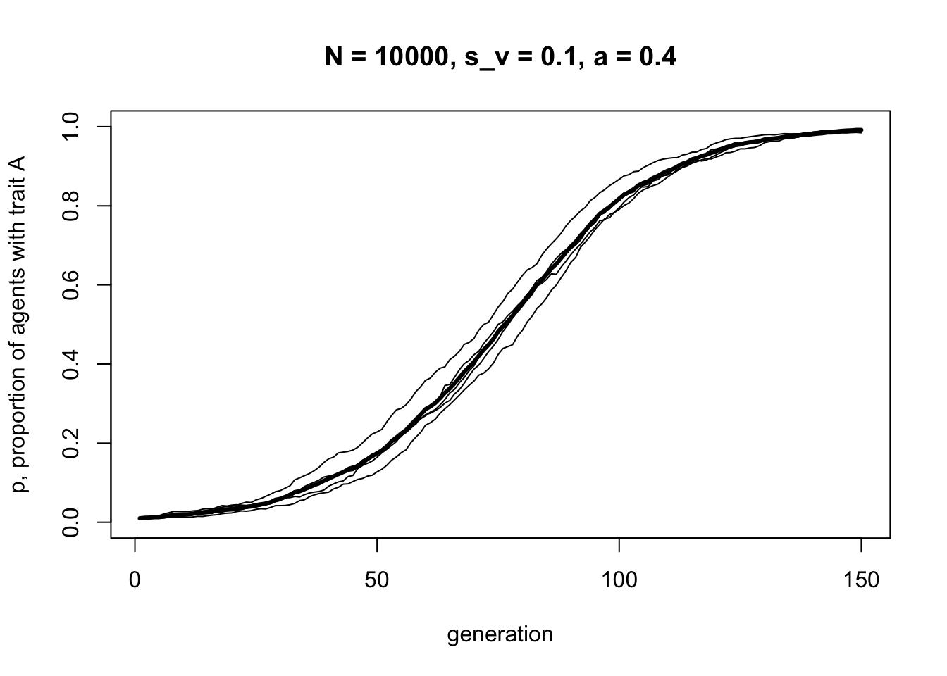 This looks a lot like the s-shaped curve we found in Model 3 for \(s = 0.1\). We have recapitulated unbiased transmission from Model 2 combined with biased transmission from Model 3, but assuming vertical cultural transmission from two parents, rather than randomly picking one demonstrator from the previous generation.