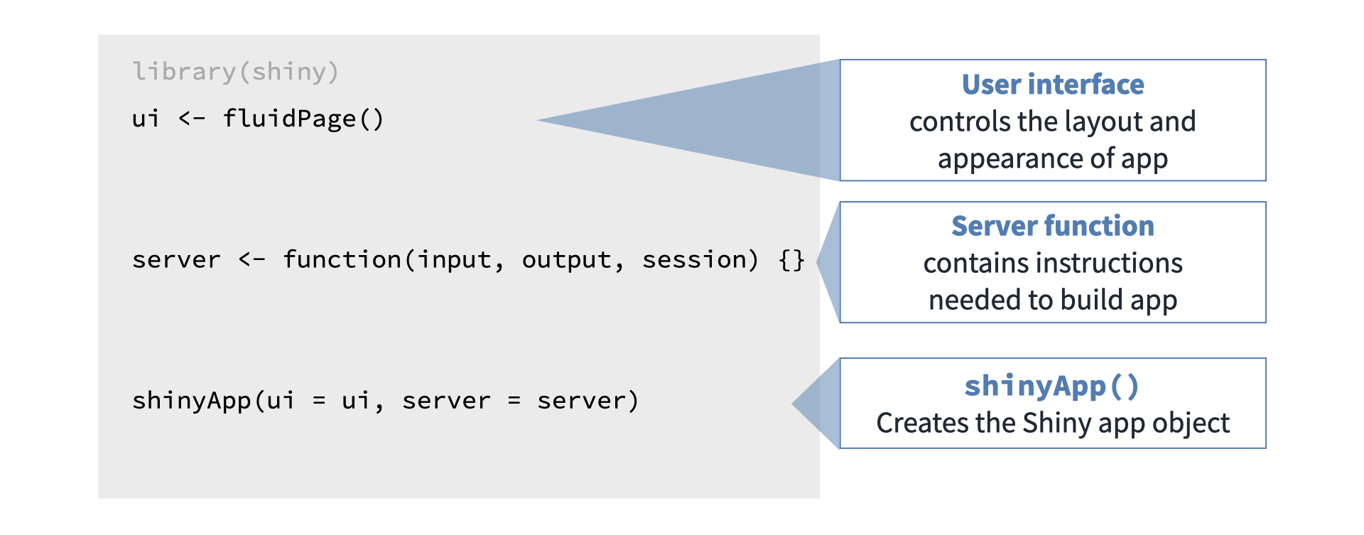shinyApp(ui, server)This template is by itself a working minimal Shiny app that doesn’t do much. It calls library(shiny) to load the shiny package, initializes a UI containing the words “Hello, world!” and then specifies the behavior of our app by defining a server function, this server is empty so it doesnt do anything, and runs an app using shinyApp(ui, server) using the parts from UI and server.