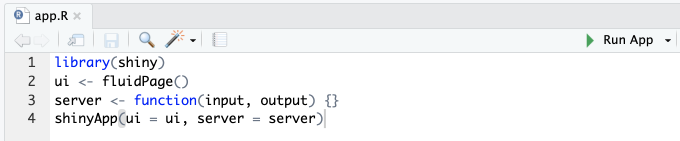 After saving the file, RStudio should recognize that this is a Shiny app, and you should see the usual Run button at the top change to Run App.