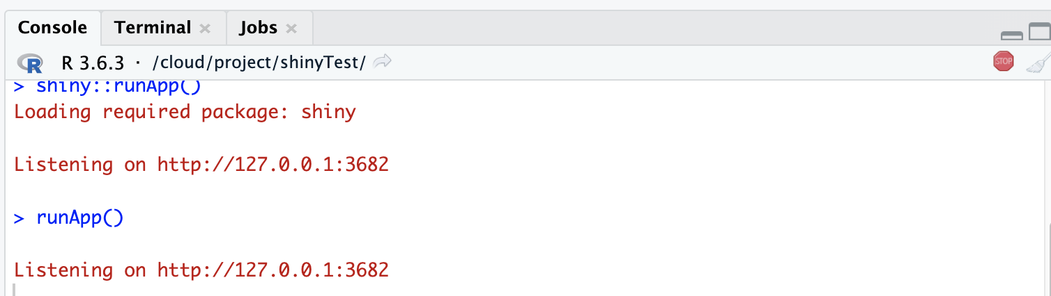 You may have noticed that when you click the Run App button, all it’s doing is just running the function shiny::runApp() in the R Console You can run that command instead of clicking the button if you prefer.