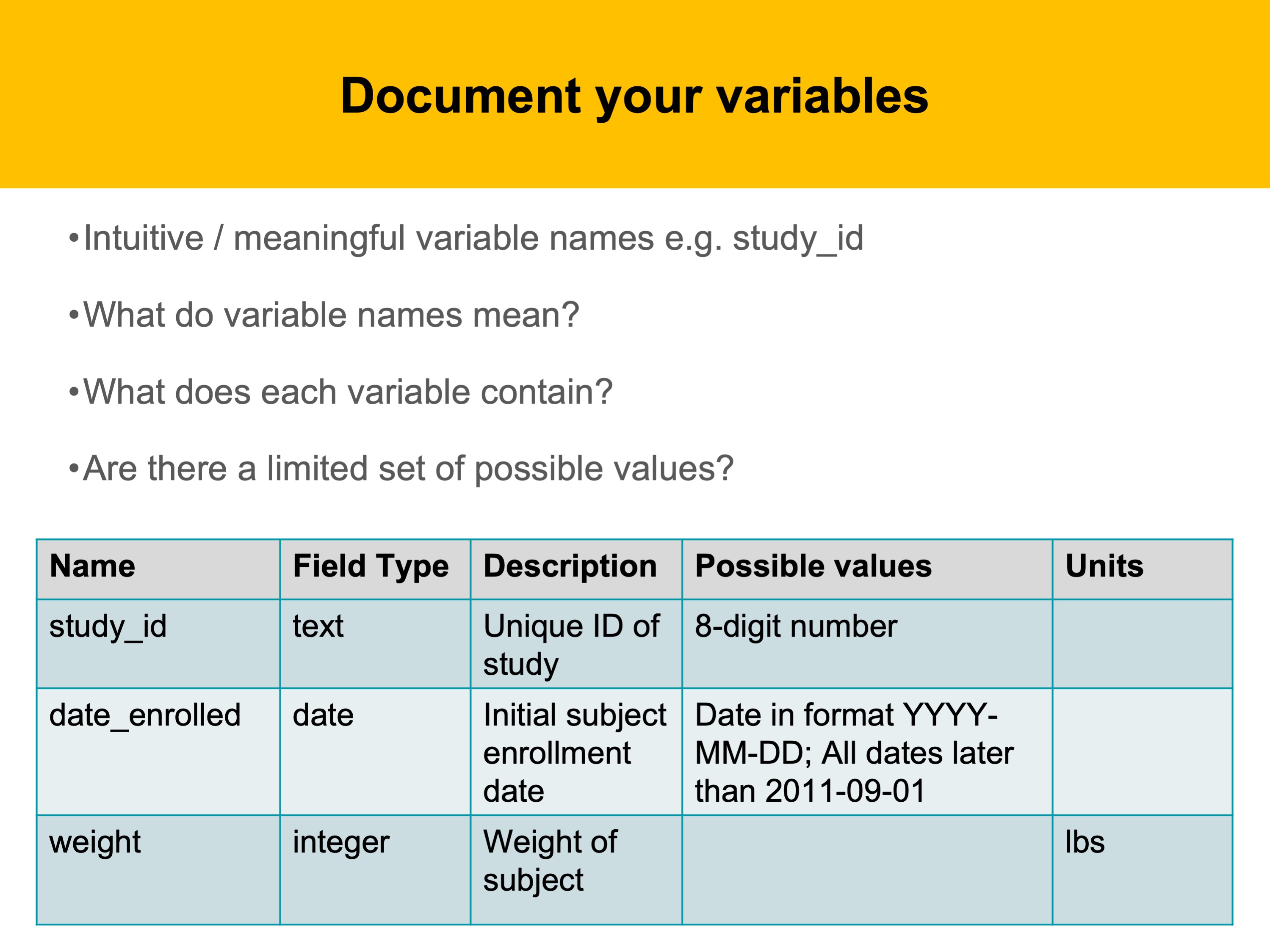 Variable labels (which should be intuitive and meaningful)) – a name that seems obvious now might be incomprehensible in a few months to yourself, let alone to someone new trying to interpret your data.