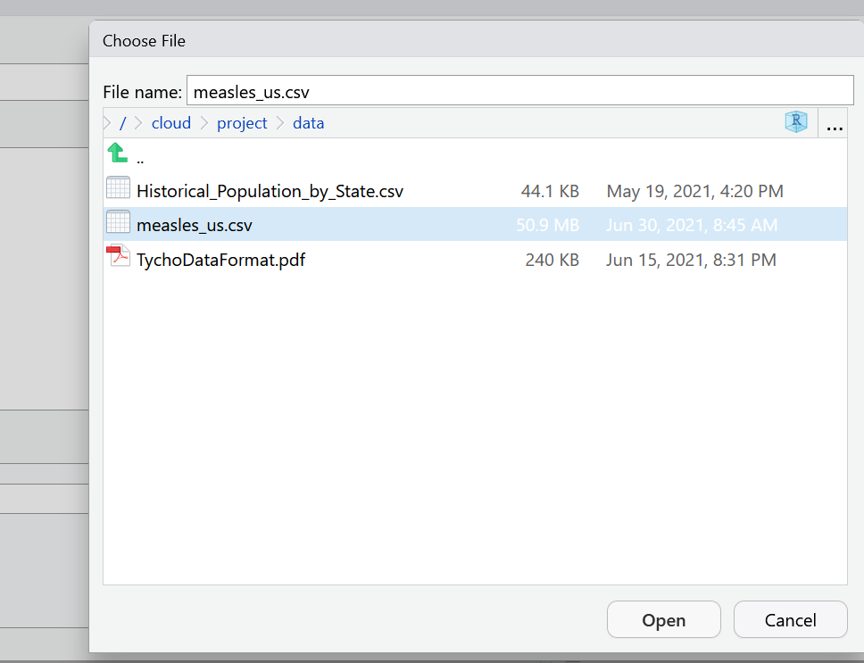 Select Browse in the dialog box that opens, and navigate to your data folder and choose the file called measles_us.csv