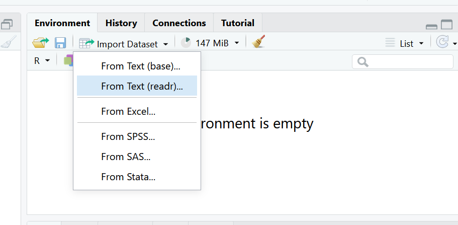 In the environment pane, select the button that says Import Dataset and choose the option From text (readr). This means we are going to be using the reader package, which is part of the tidyverse to read a file.