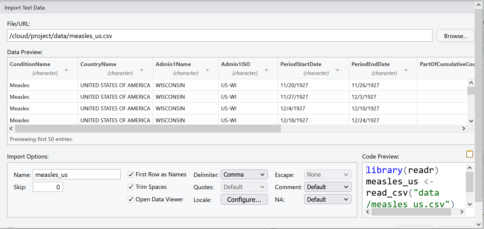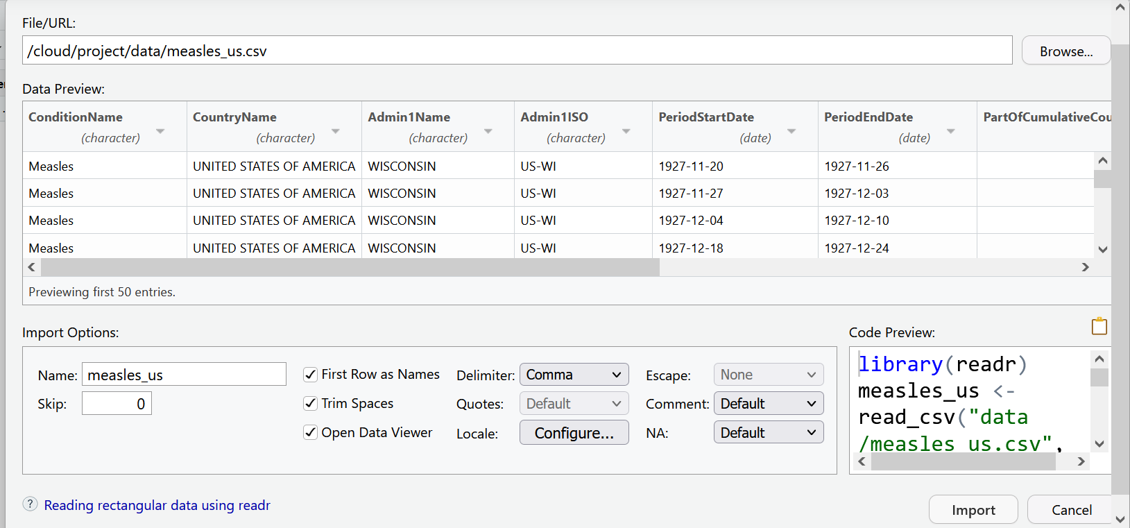 RStudio will use the file name as the default name for your dataset, but you could change it to whatever you want. In this case measles_us works pretty well.
